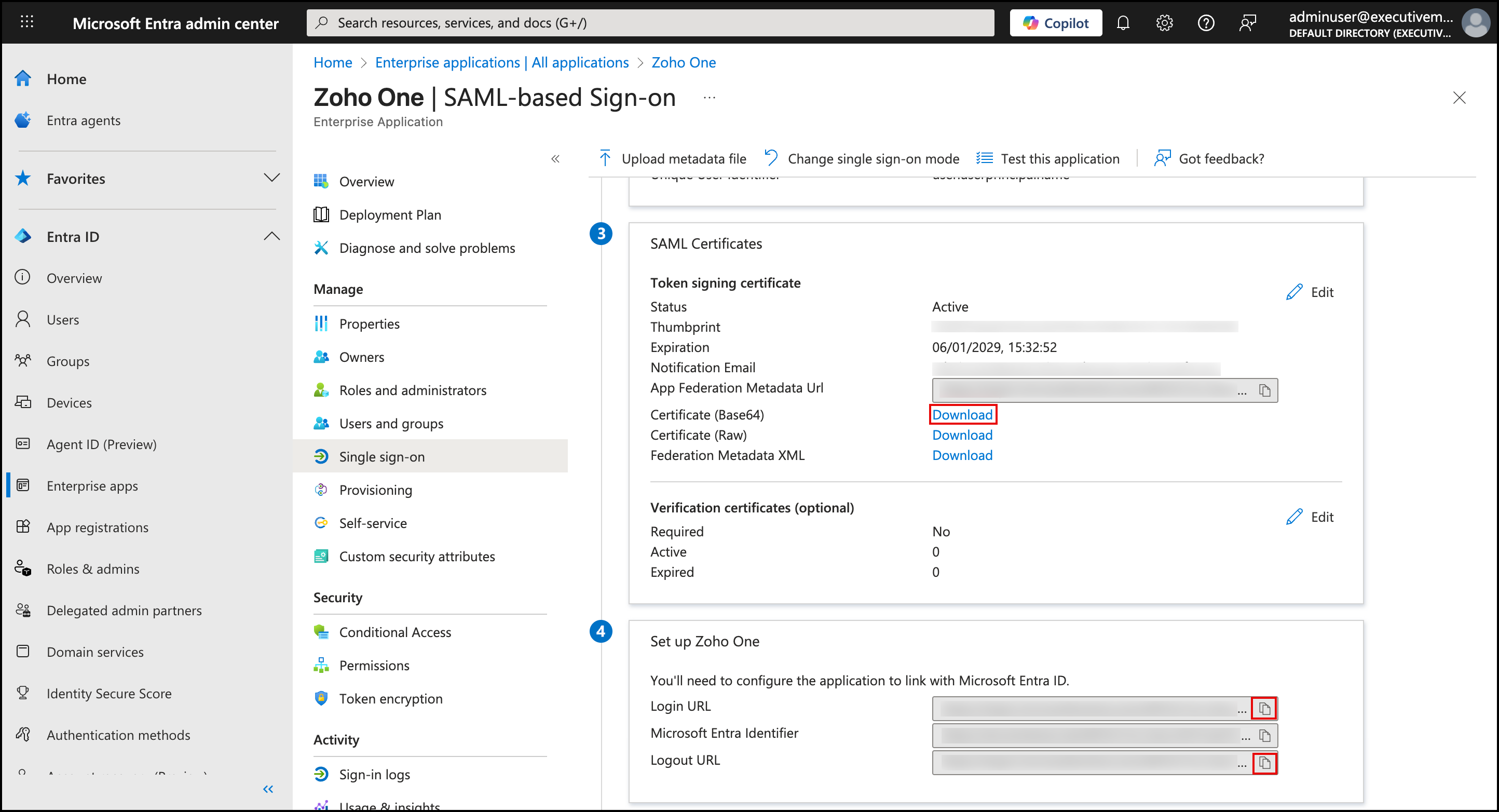 6. Using the tokens copied in the previous step, add Zoho One as an app in your Microsoft Entra ID instance. Copy the Login URL and Logout URL of the created app, and download the Base64 certificate.