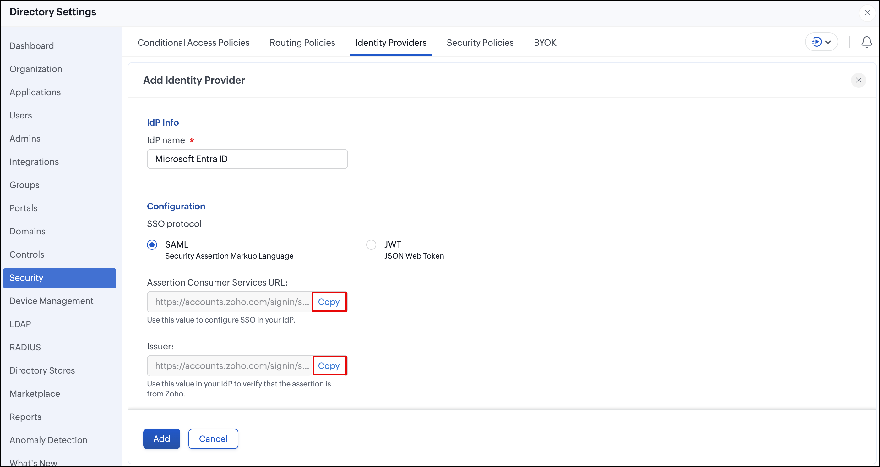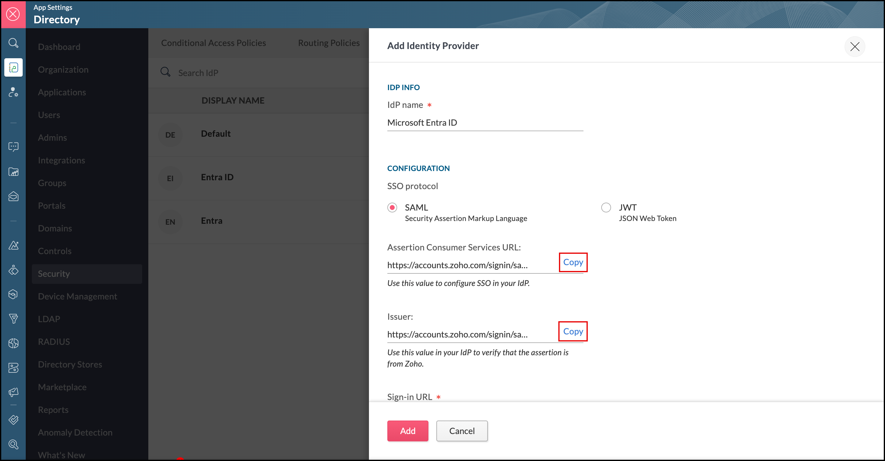 9. Click Add. You have added Microsoft Entra ID as an Identity provider in Zoho One.