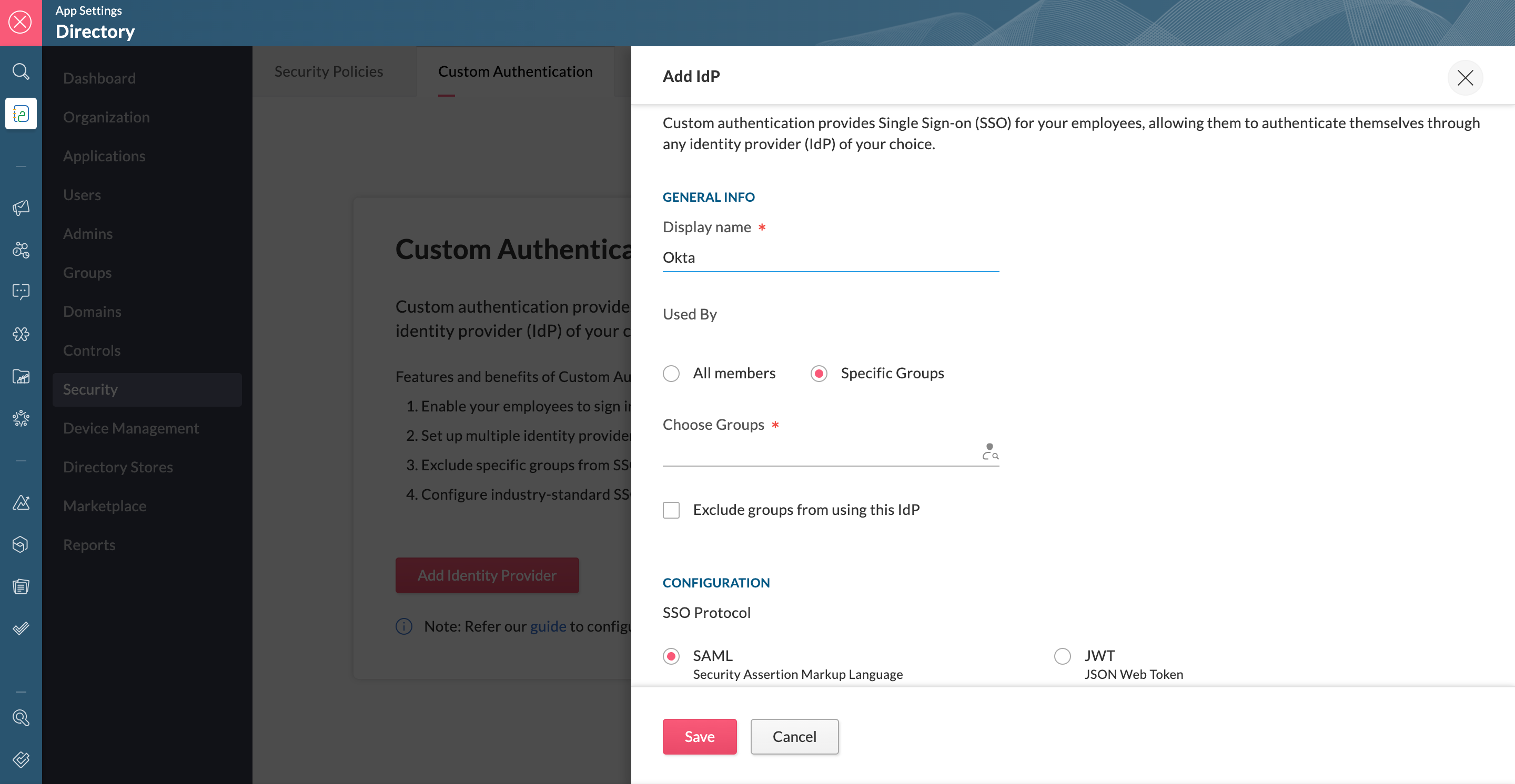 Custom authentication enables both SAML and JWT single sign-on (SSO) from your preferred identity providers (such as Okta or OneLogin) to Zoho One. You can set up custom authentication for a specific user group or all users in the organization.    ...