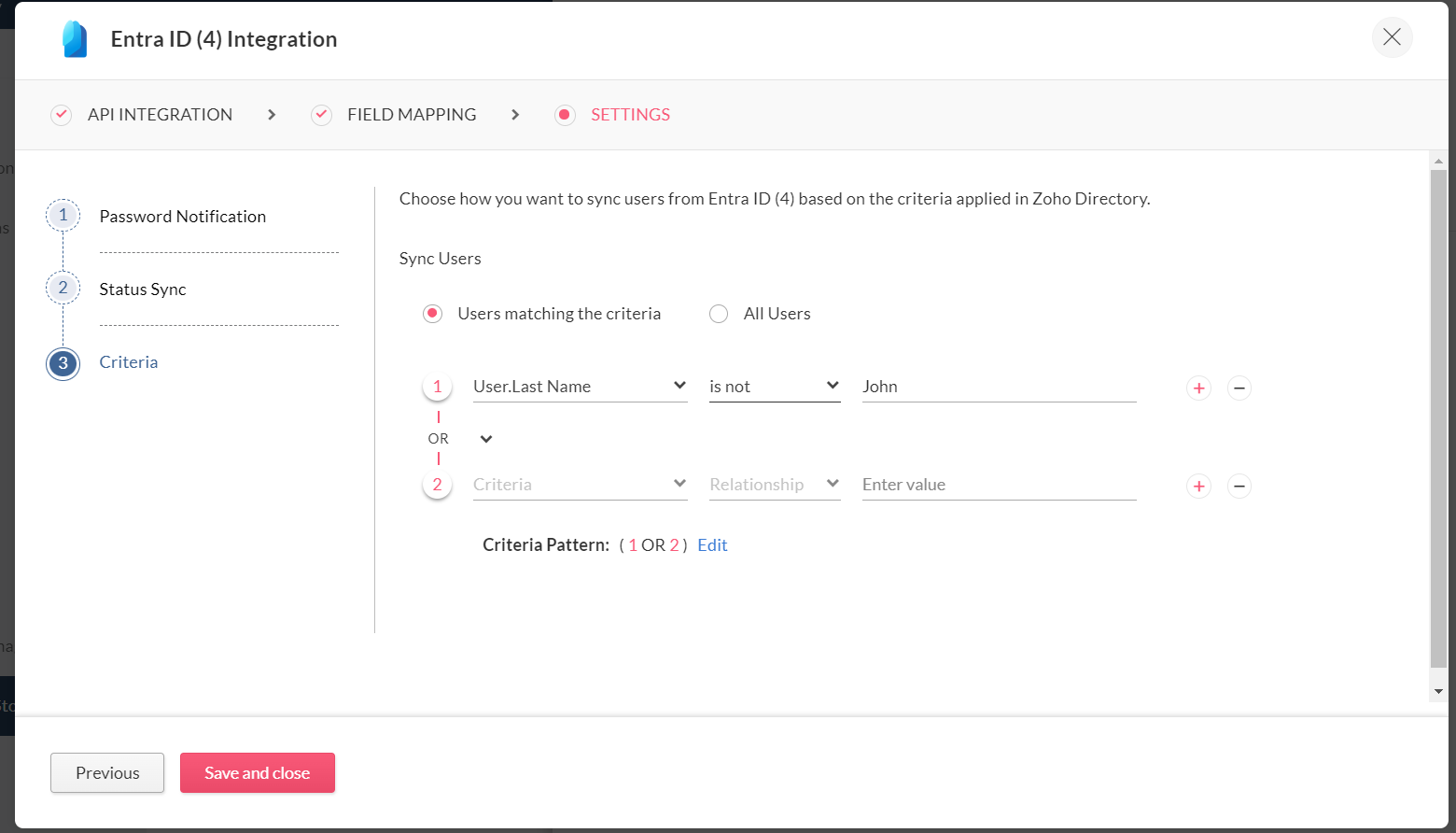 To set criteria, select a criteria from the options, choose a relationship, and enter the criteria's value as needed.