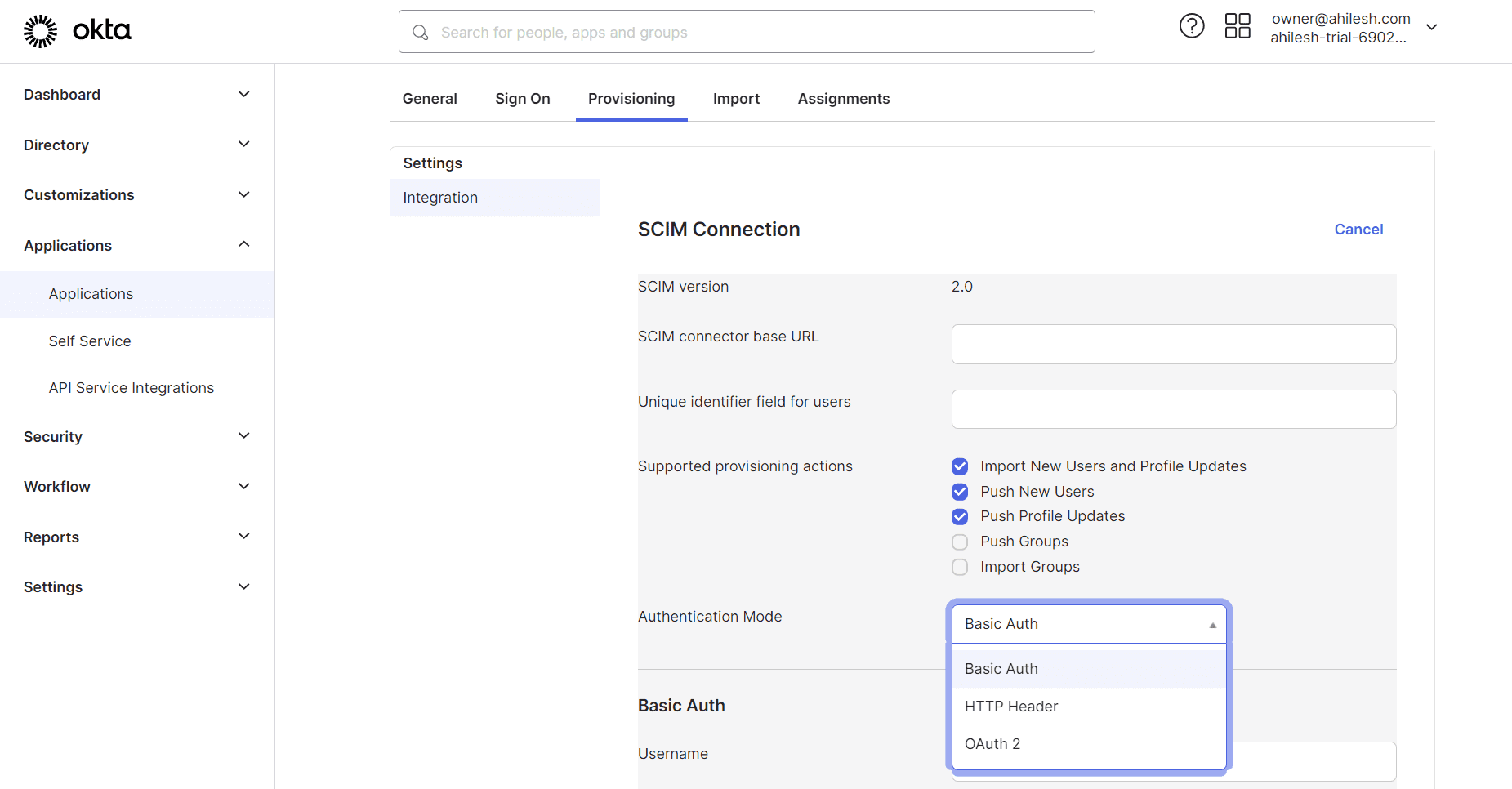 Enter the Sync endpoint copied from Zoho One in SCIM connector base URL. Enter email in the Unique identifier field for users field, and select the Push New Users option (as well as Import New Users and Profile Updates, and Push Profile Updates, optionally) in Supported provisioning actions field.