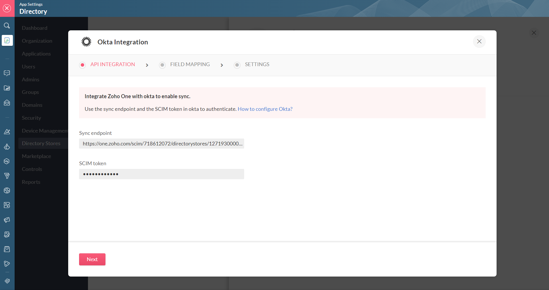 Under API INTEGRATION, note down the Sync endpoint and SCIM token. Later, you'll need to provide this information in Okta to enable sync.