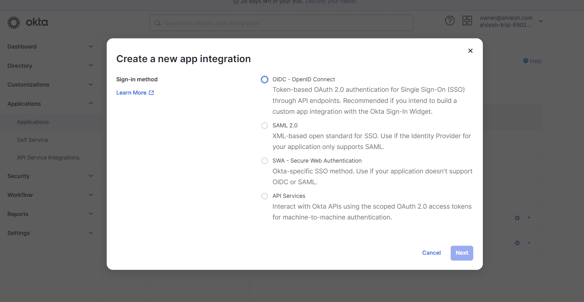 Click Create App Integration. Select SAML 2.0, then click Next.