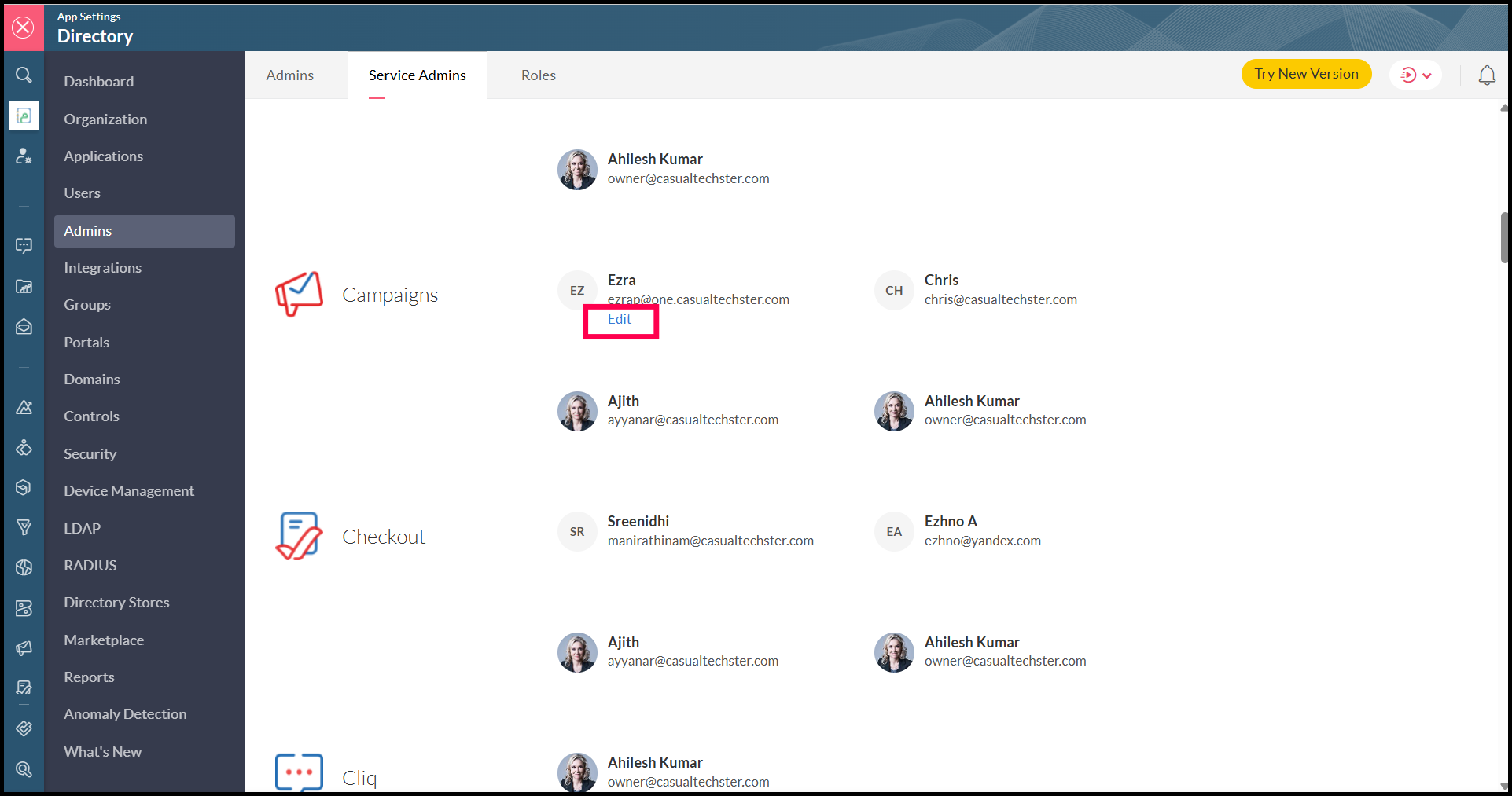 1. In the Service Admins tab, navigate to the required application. Hover over the required user and click Edit.