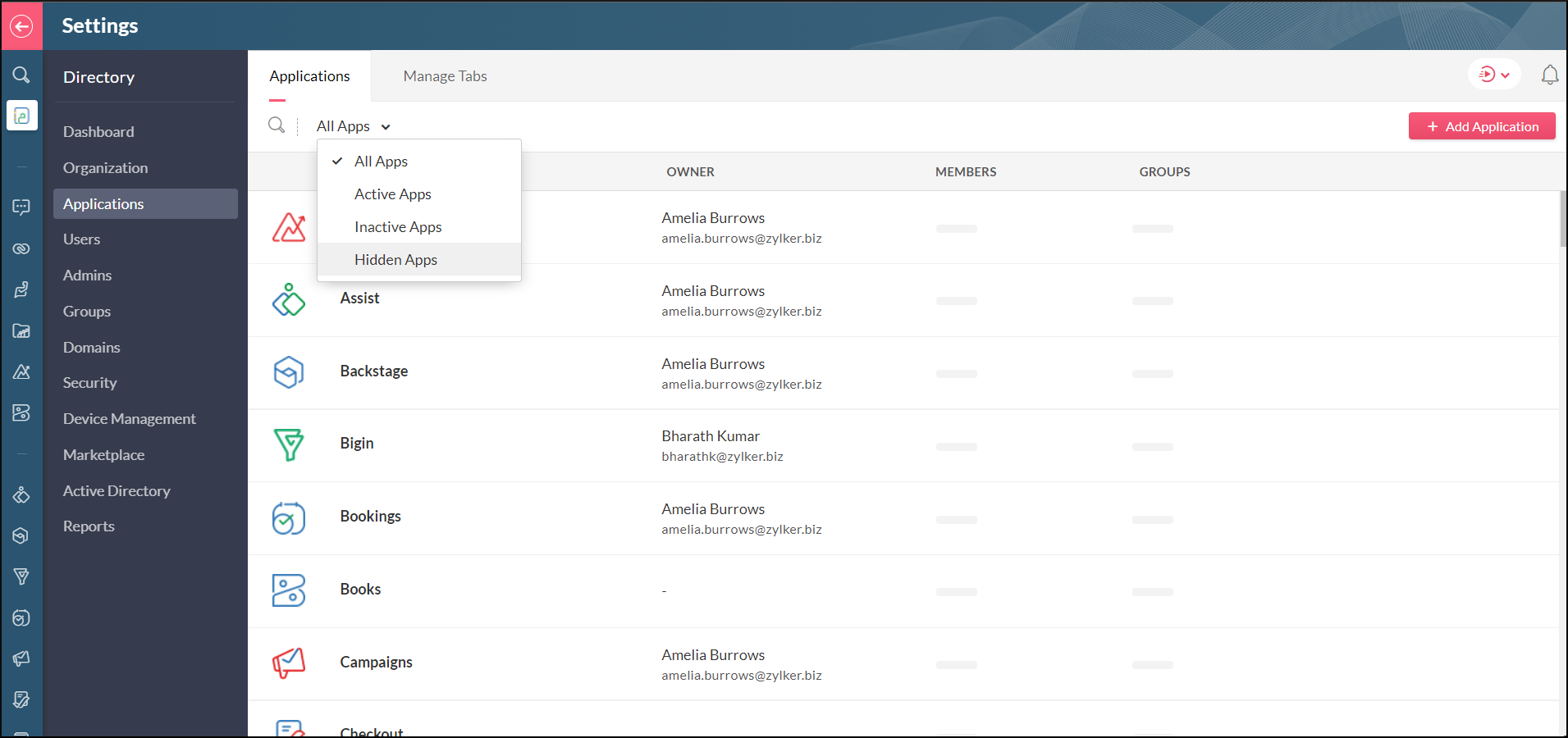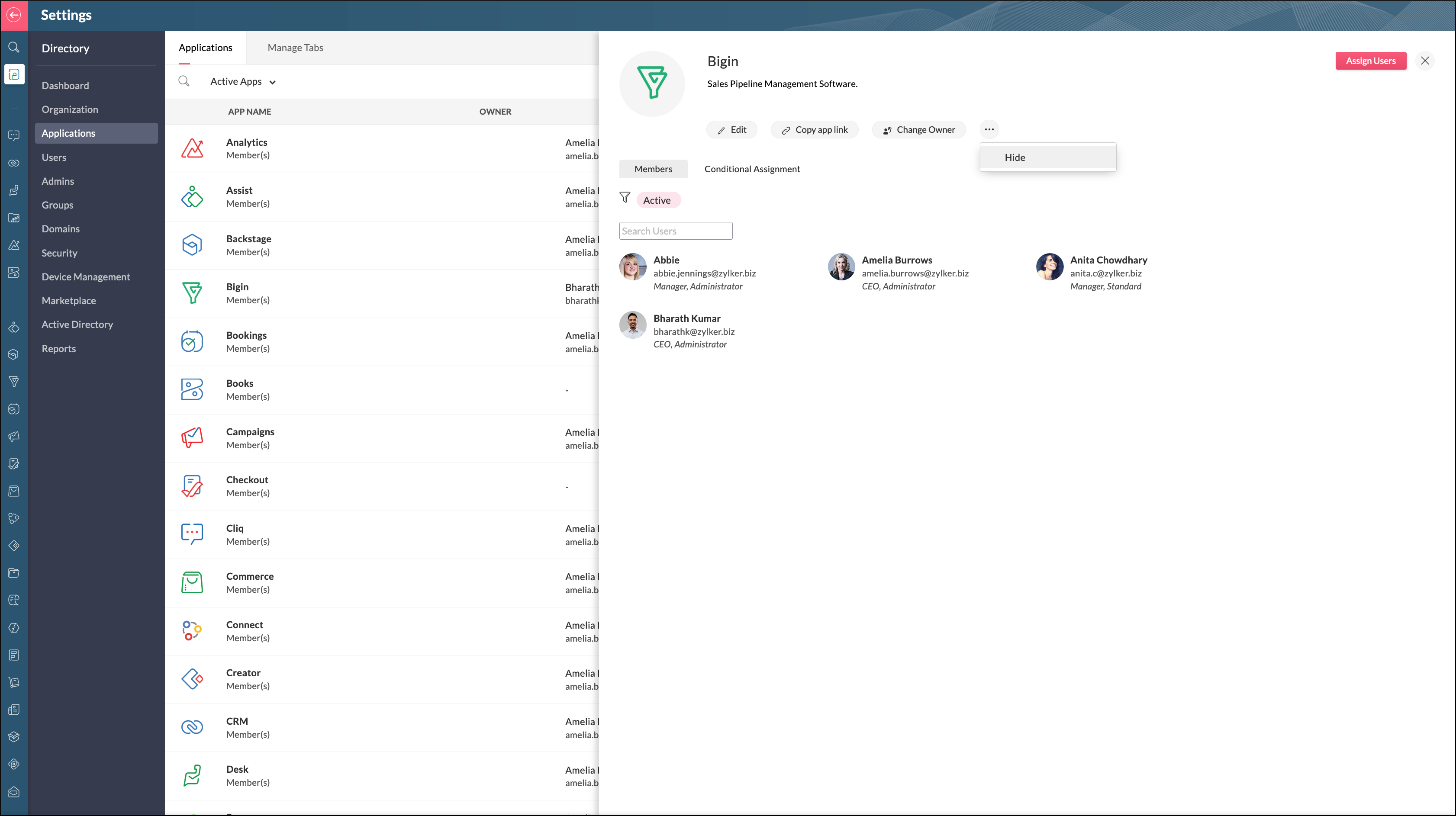 Applications - Hide/Unhide App | Admin Guide - Zoho One