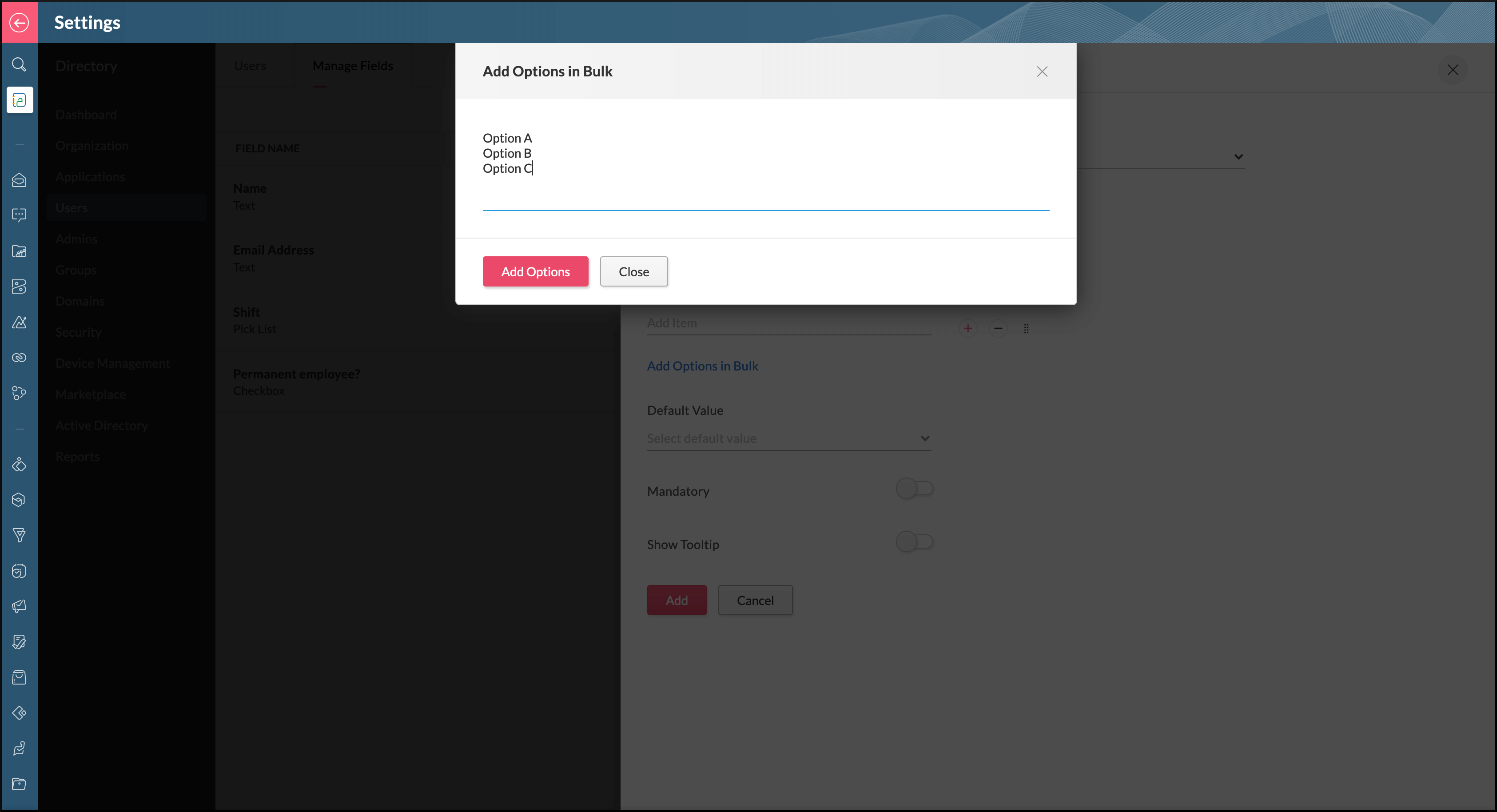 6. If you chose Pick List as the field type, enter at least two input options. To simplify adding multiple options, click Add Options in Bulk and enter one input per line in the text box, then Add Options after entering all the inputs. Choose a Default Value from your options.
