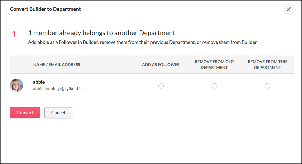 1. Check Add as follower to convert all the conflicting members in the group to followers of this department. They will have access to all the resources of this department, but will only be considered members of their primary department.