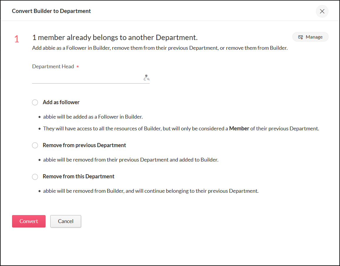 NOTE: If none of the above options is chosen, then all the members of the group will be converted to followers of this department by default.
