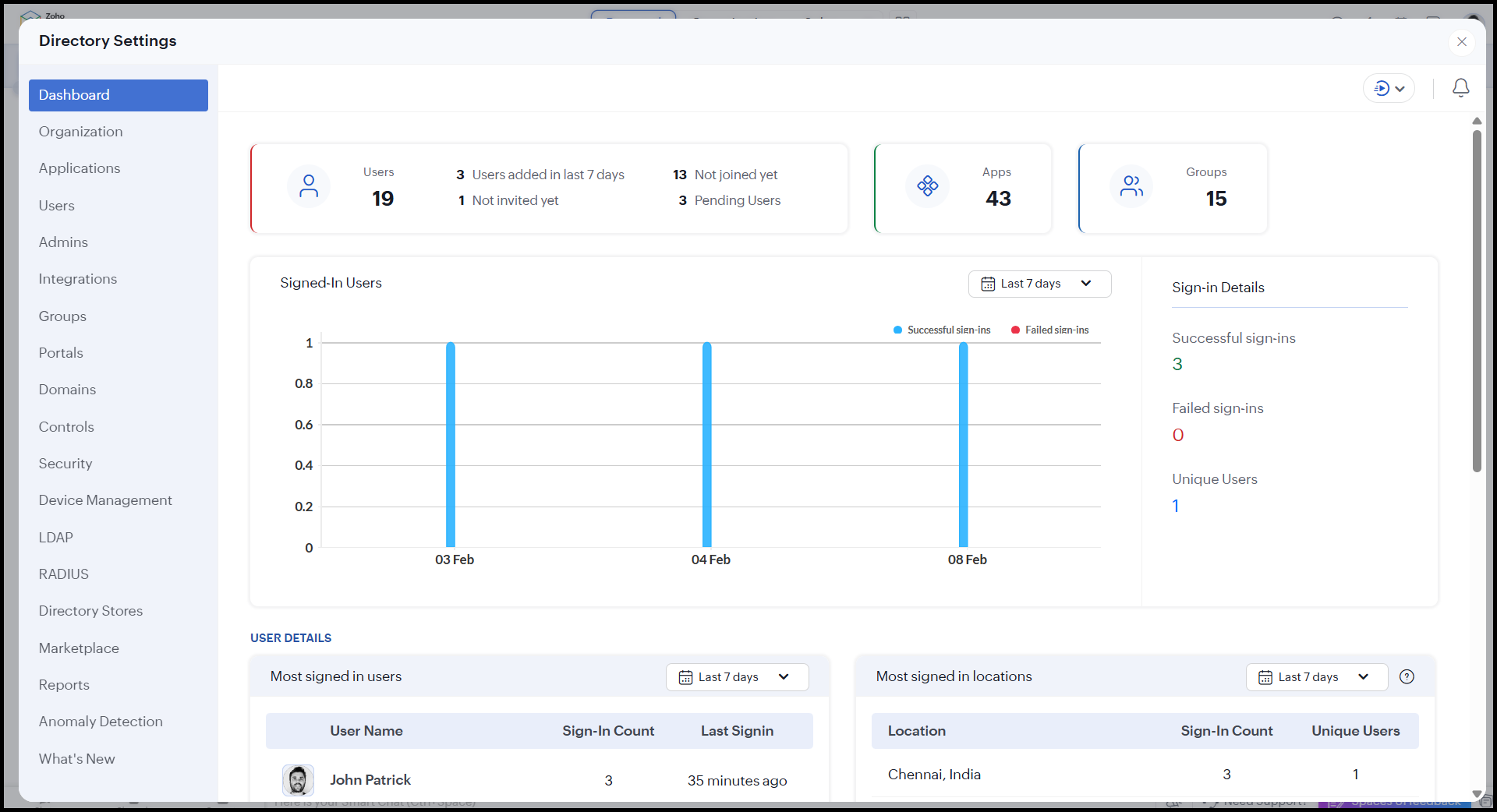 User sign-ins in apps | List of user sign-ins in individual Zoho apps added to Zoho Directory | |