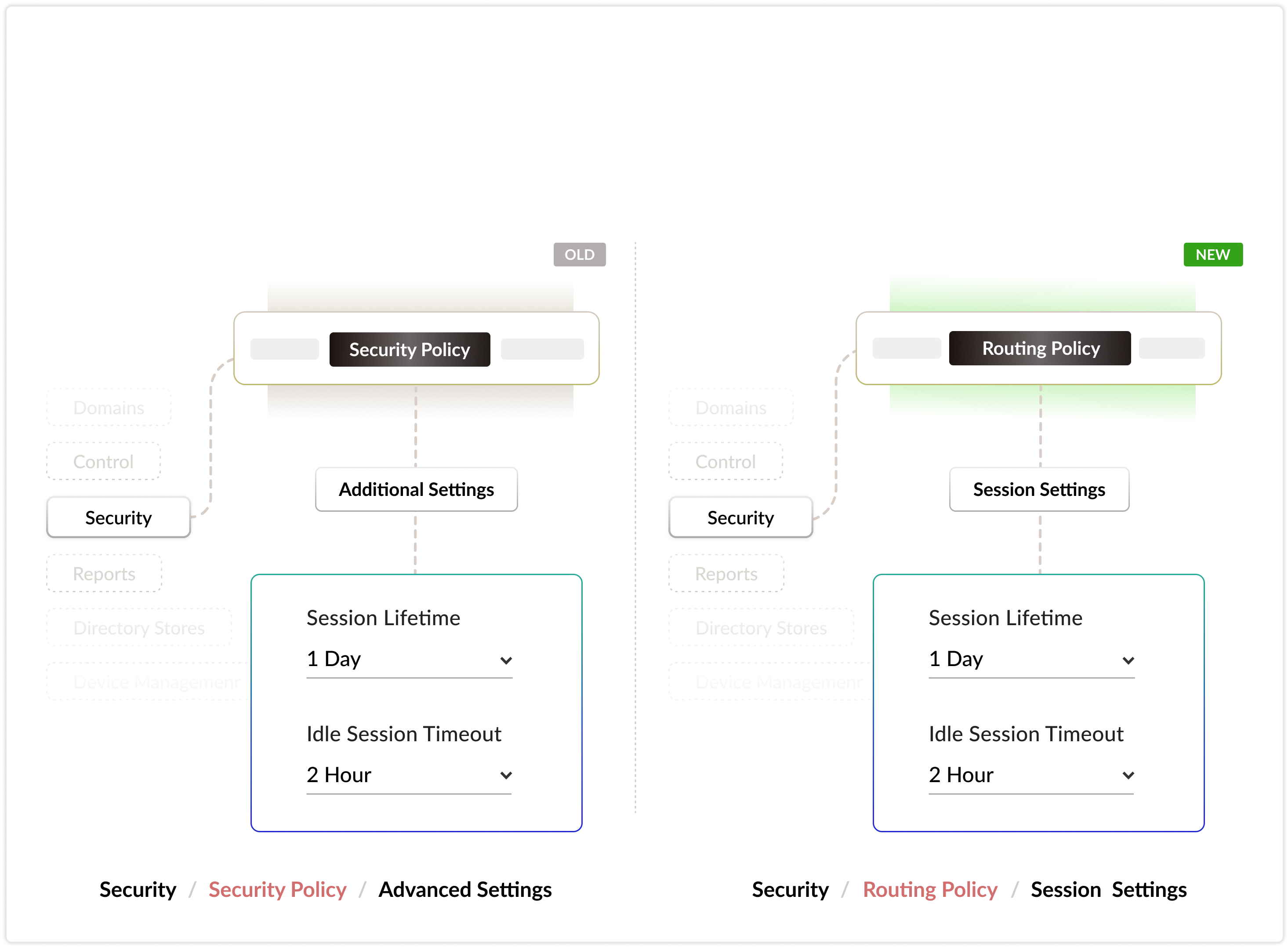 If Session Lifetime and Idle Session Timeout are configured under Advanced Settings within Security Policies, both settings will be migrated to the Routing Policies.
