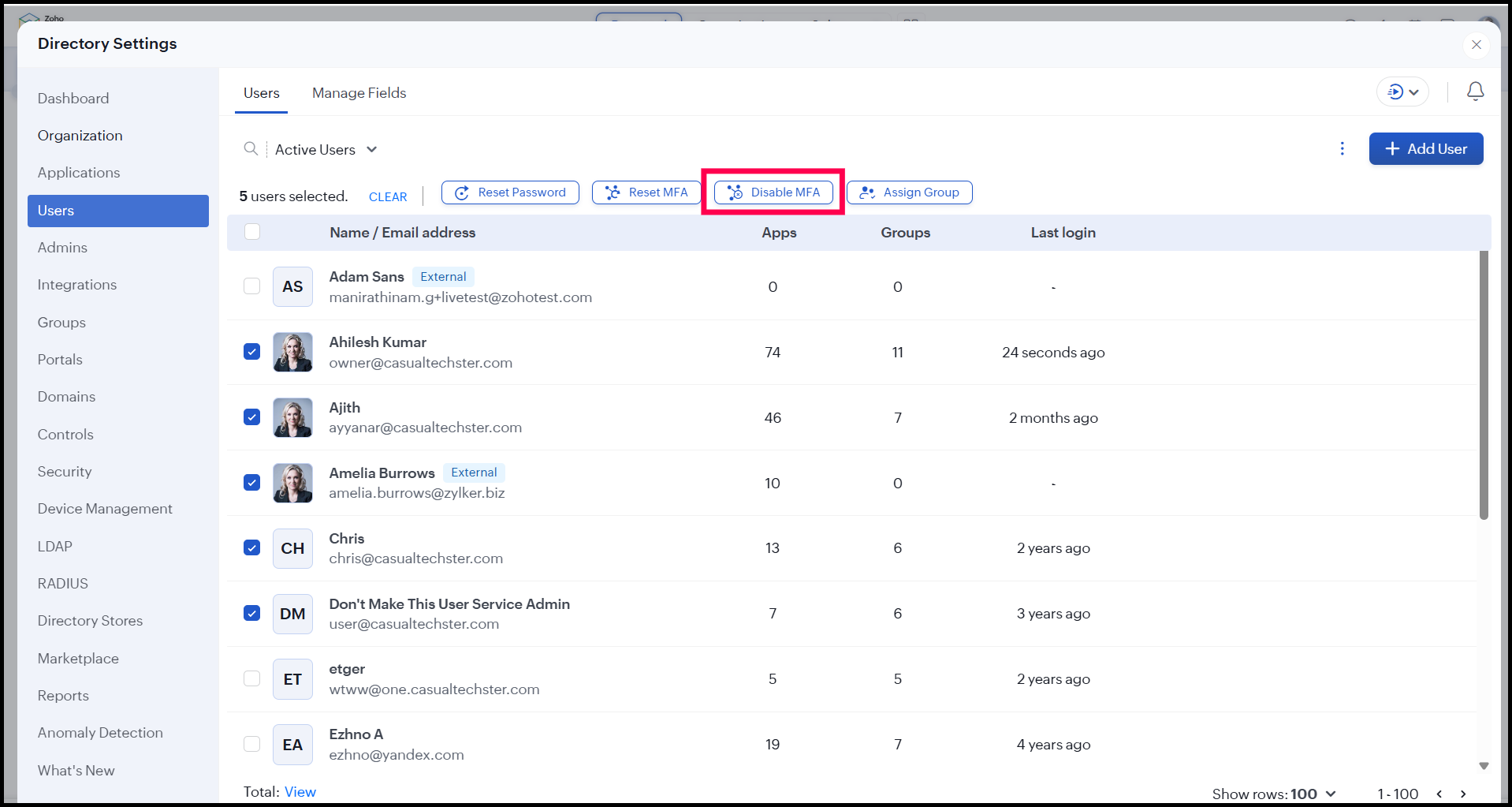 5. To disable MFA for bulk users, after selecting them, you can either find the Disable MFA option at the top or access the Quick Actions menu () in the top-right corner and click Disable MFA