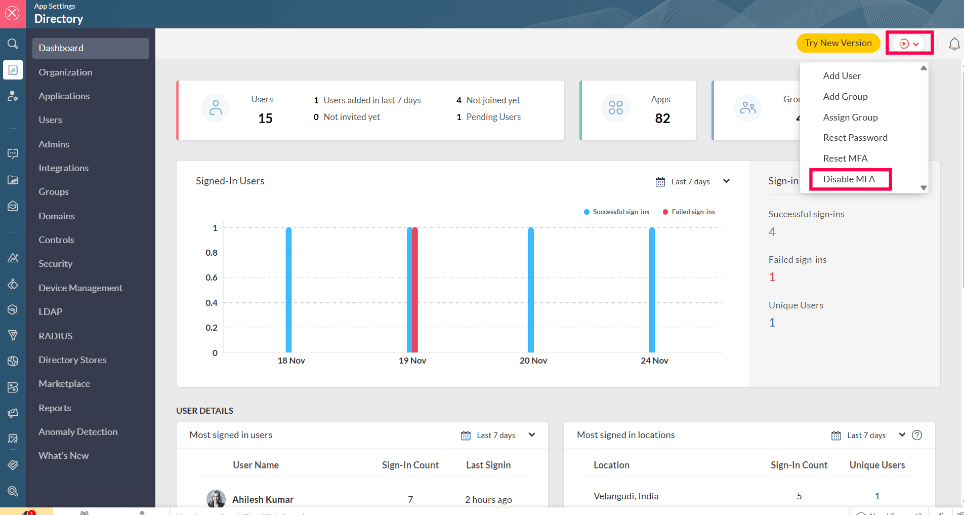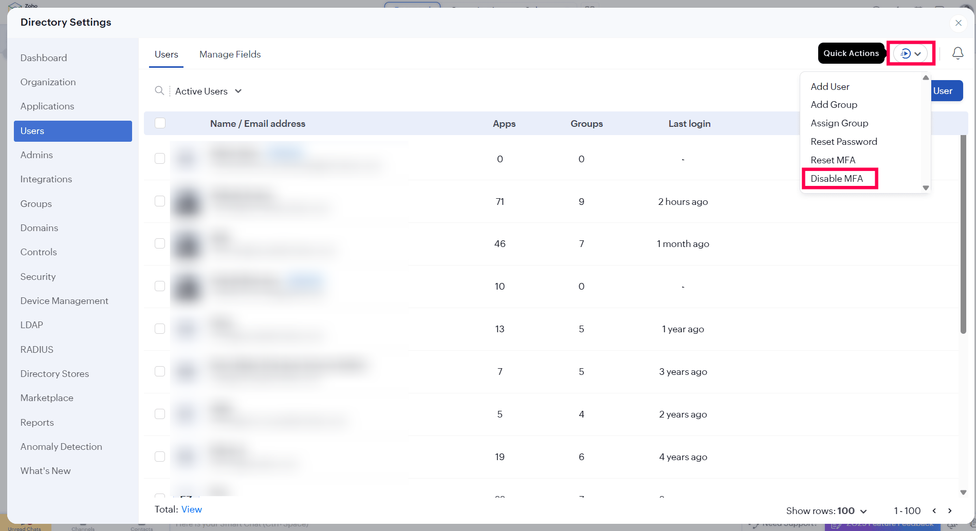 5. To disable MFA for bulk users, go to the Quick Actions menu () in the top-right corner and click Disable MFA