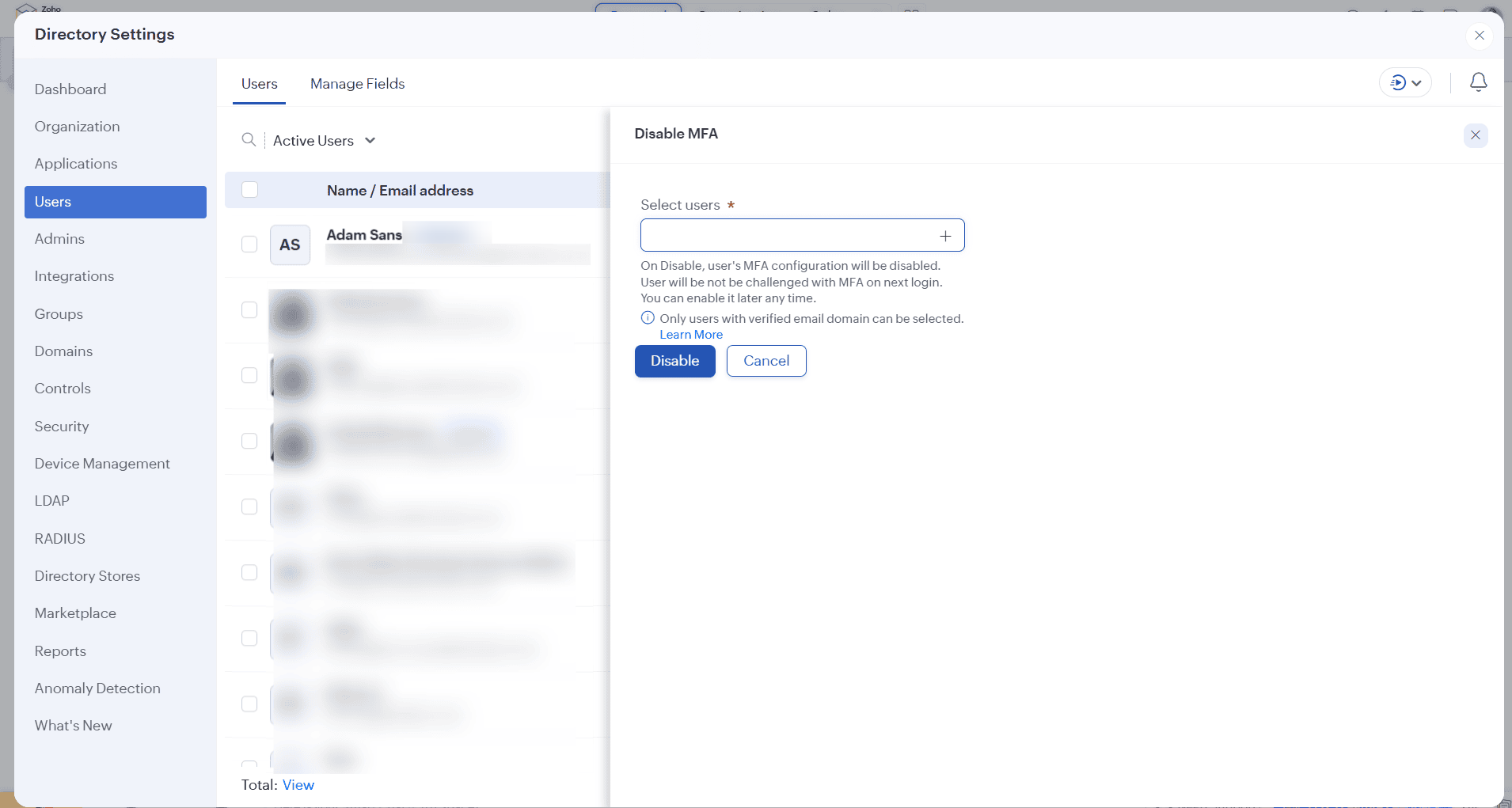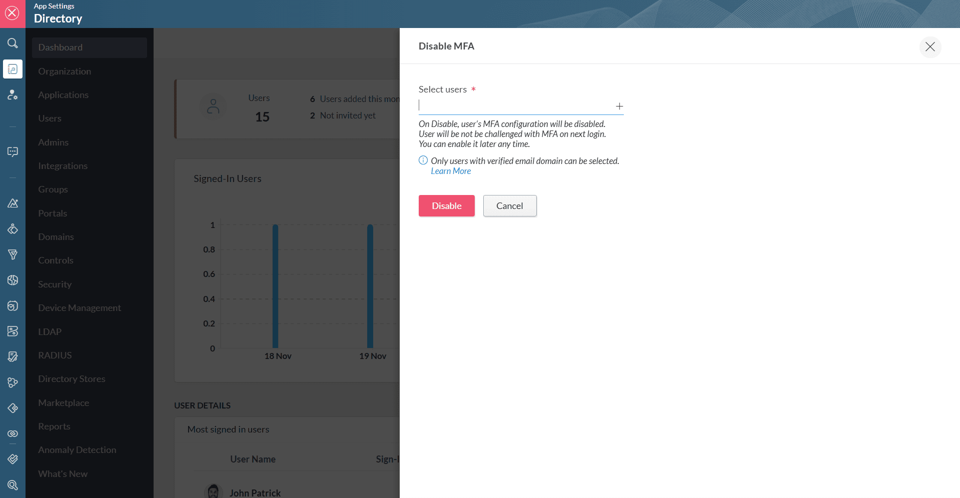 Once disabled, the user's MFA configuration will be disabled, and the user will not be prompted for MFA during their next login. You can enable it later, at any time.