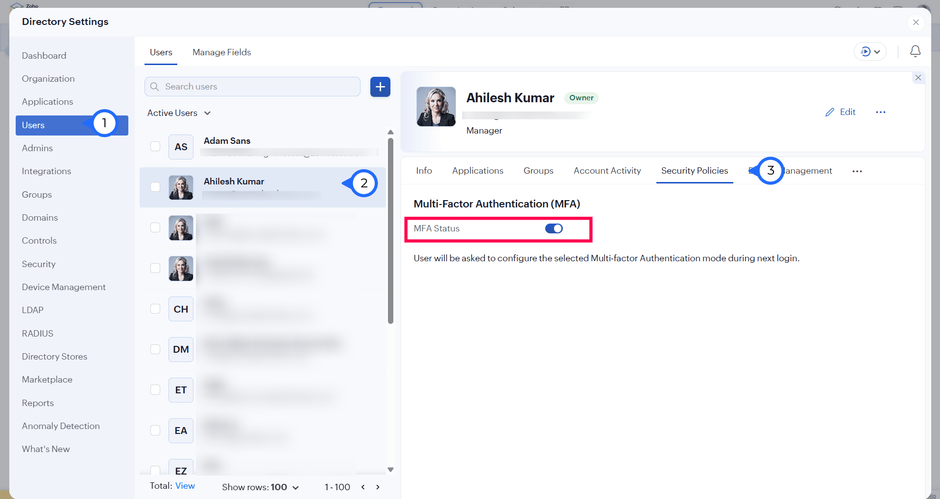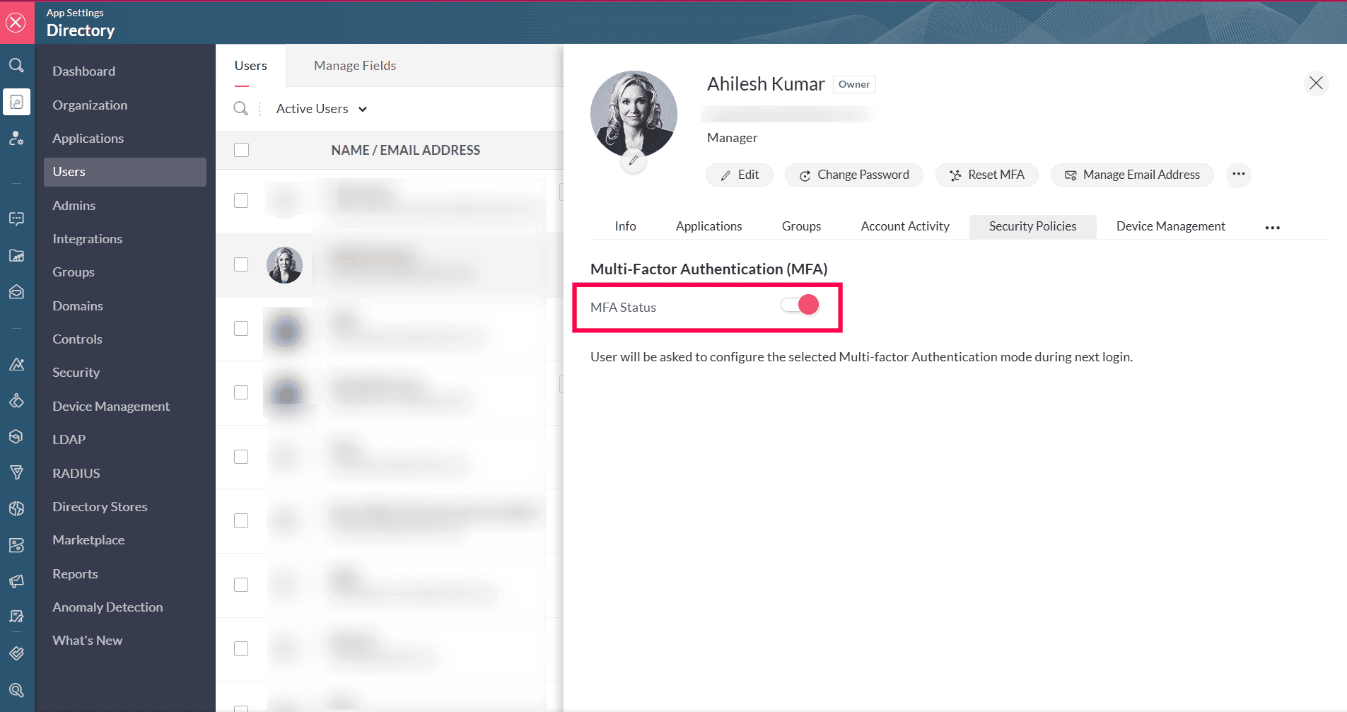 2. Click Users in the left menu, then click on the user for whom you want to disable MFA.