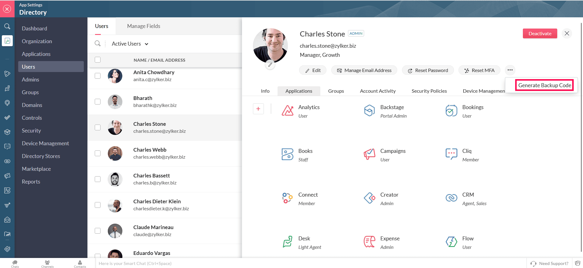 Note: You will see this Generate Backup Code option only for the confirmed users in your organization.