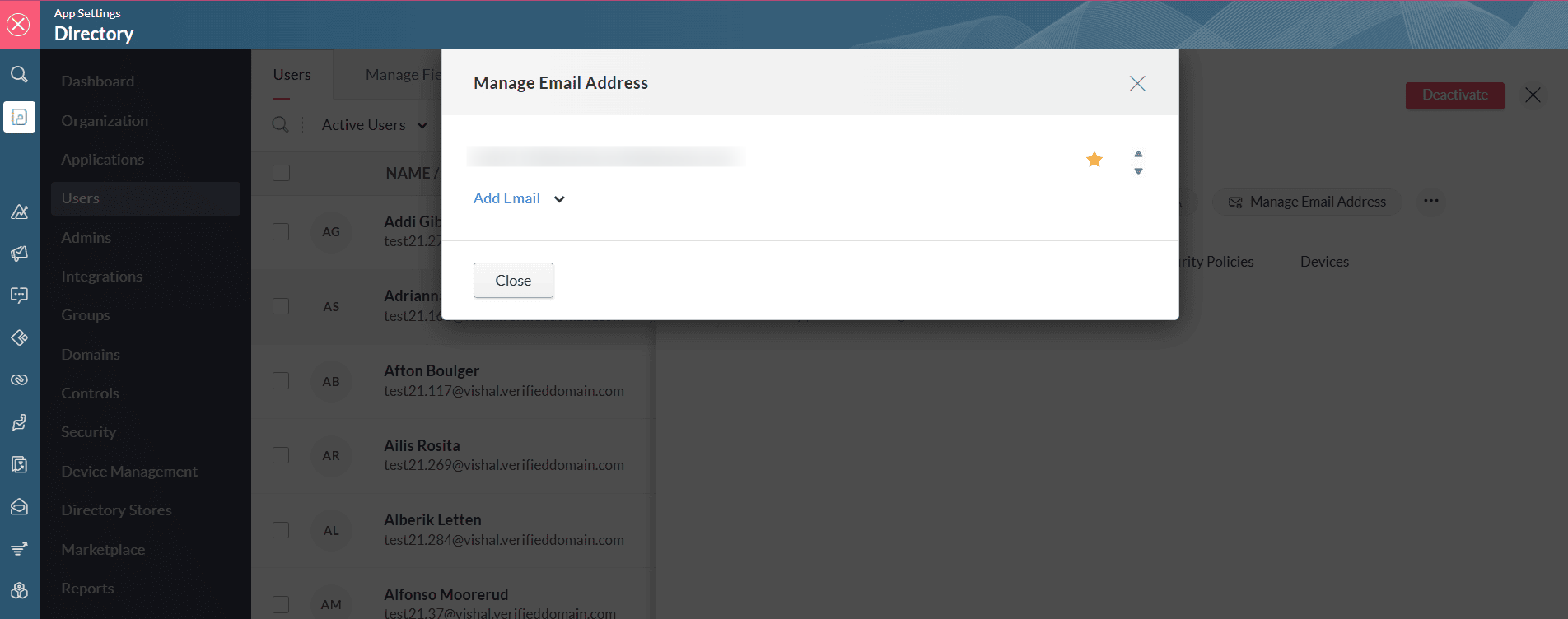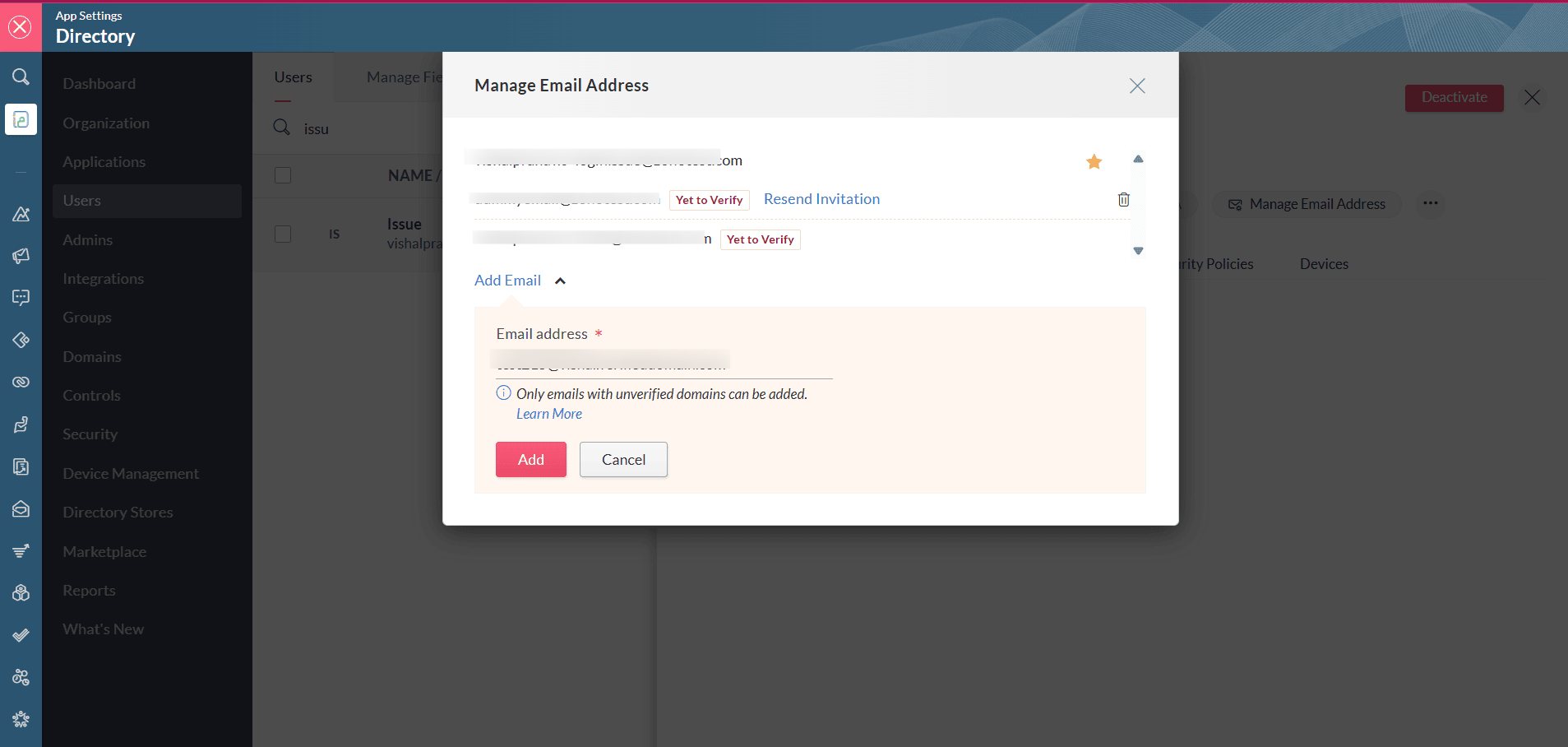 You can add only unverified domains as secondary email addresses. Adding a verified domain as a secondary is restricted for security reasons. To add a verified domain, you can contact the users to visit accounts.zoho.com, or you can reach out to support@zohoone.com for further assistance.
