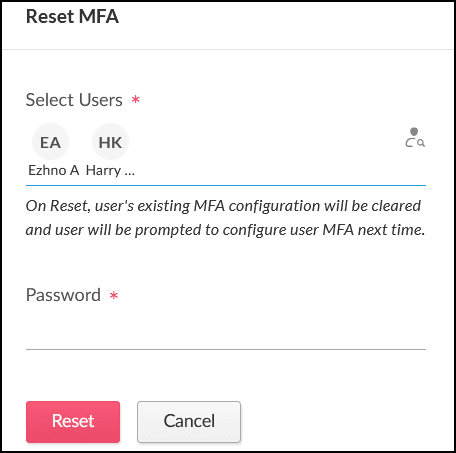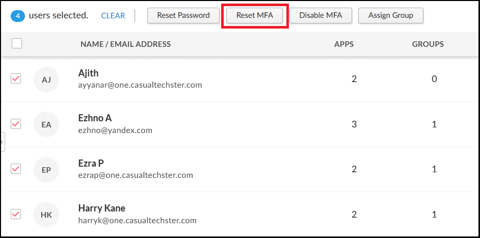 To reset MFA for multiple users, select the users whose MFA need to be reset, then click Reset MFA.