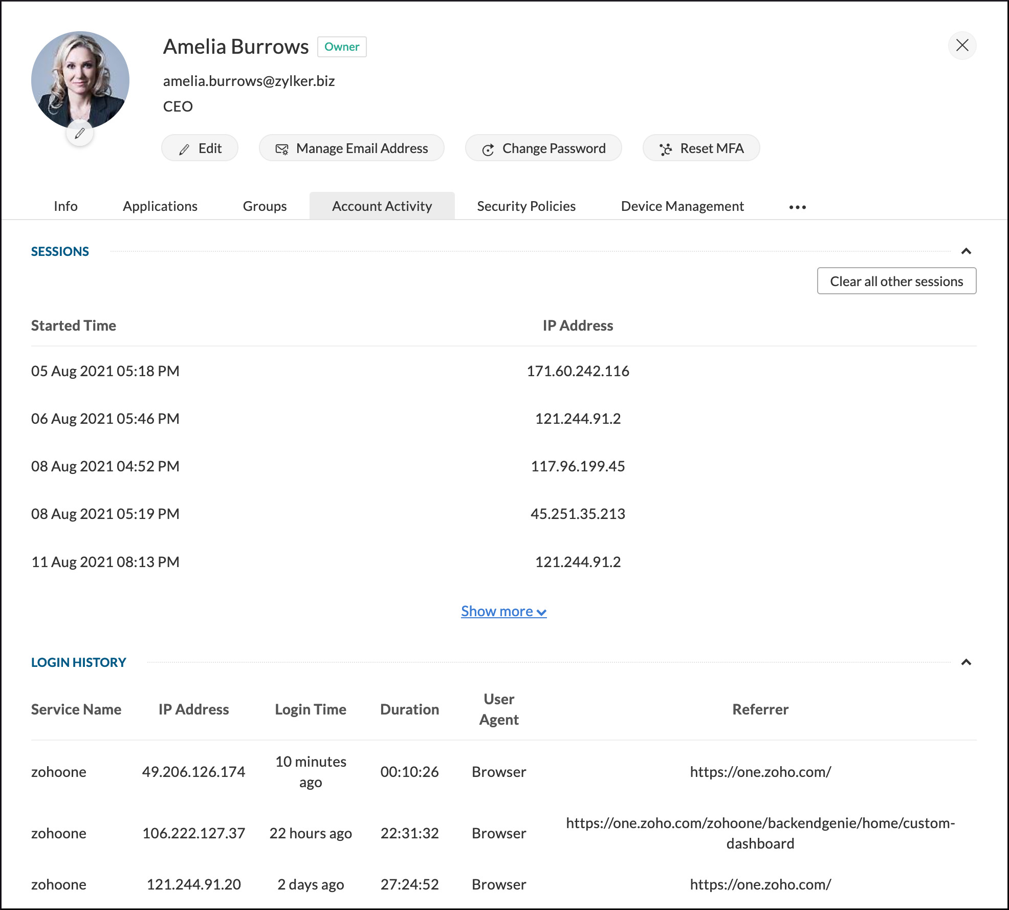 People generally sign in to their account, finish their tasks, and just close their browsers without signing out. This isn't a problem as long as the person is using a personal or work computer. However, it becomes a problem if your employees travel a great deal, and sign in from public computers. Leaving active sessions open in public computers is a huge security issue. If you see an employee who has multiple active sessions, clearing the older ones can help you keep your organization safe.
