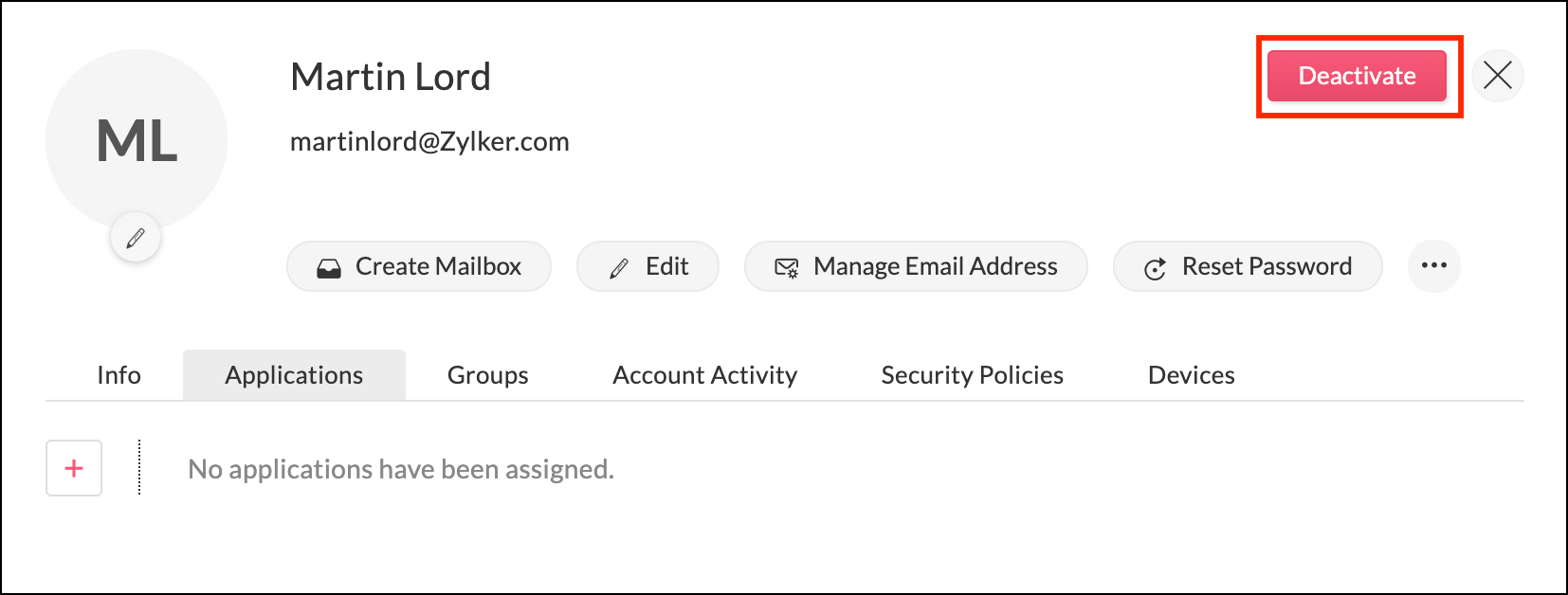 Deactivating a user in Zoho One means temporarily revoking that user's access to the Zoho One organization and Zoho One application without deleting their account.