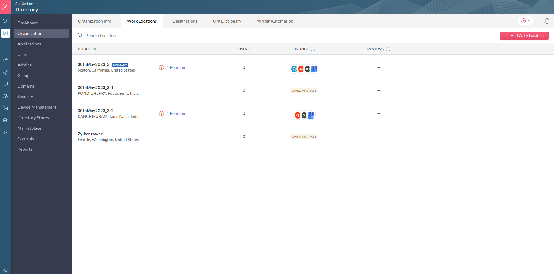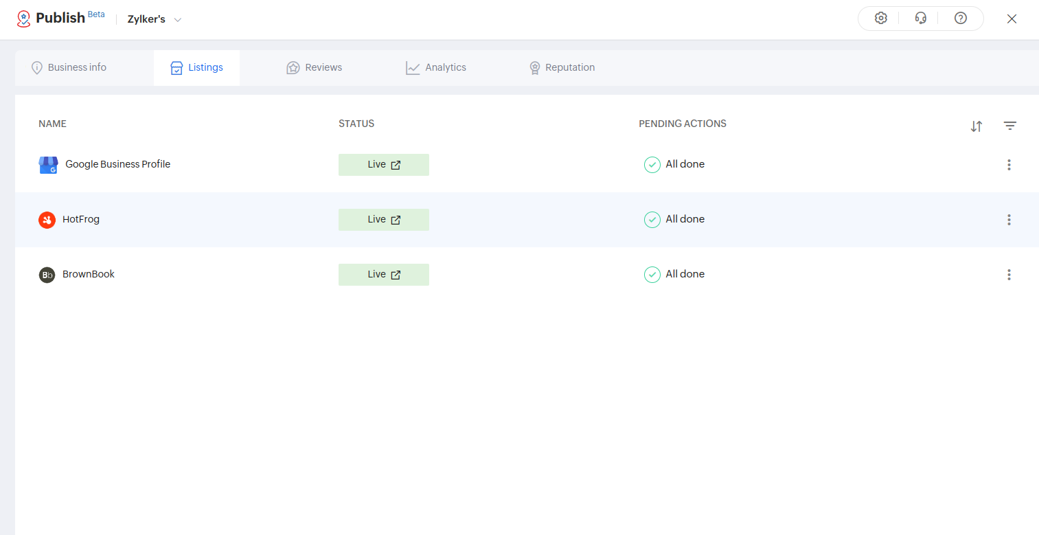 On the Work Locations page, the icons of the listings where a business has been published are displayed under a separate column header Listings. To land on the Listings page, click theicon corresponding to a published business whose listings you want to view. Click View.
