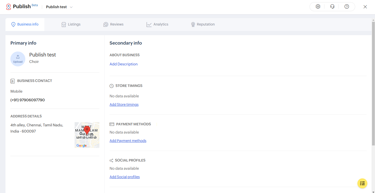 Under Business Info, you can update the PRIMARY INFO namely Contact Details, Payment Methods, Social Profiles, Gallery, Store Timings, and Other Info. You can add an Email Address and website (optional), add a brief description about your business and its location under SECONDARY INFO. The description must not exceed 750 characters.