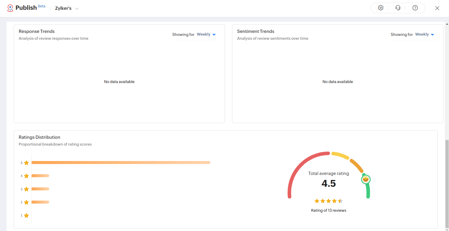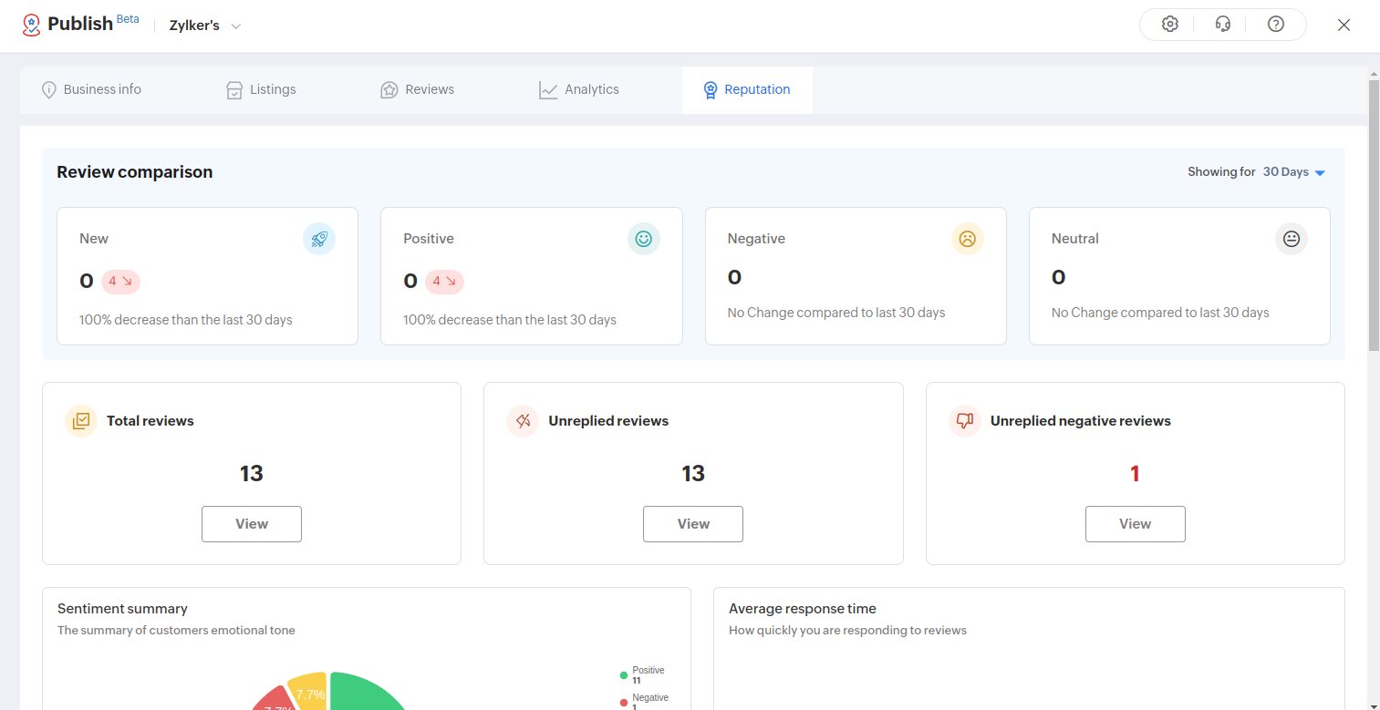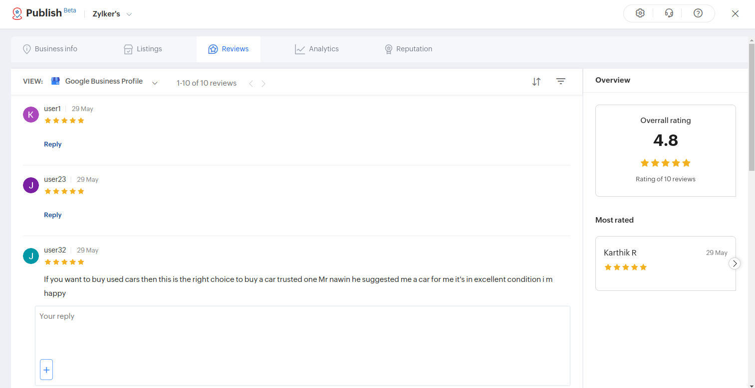 The owner of a business can address the reviews left by users in each listing and can respond accordingly. Overall ratings and the name of the user who has rated most appears on the right.