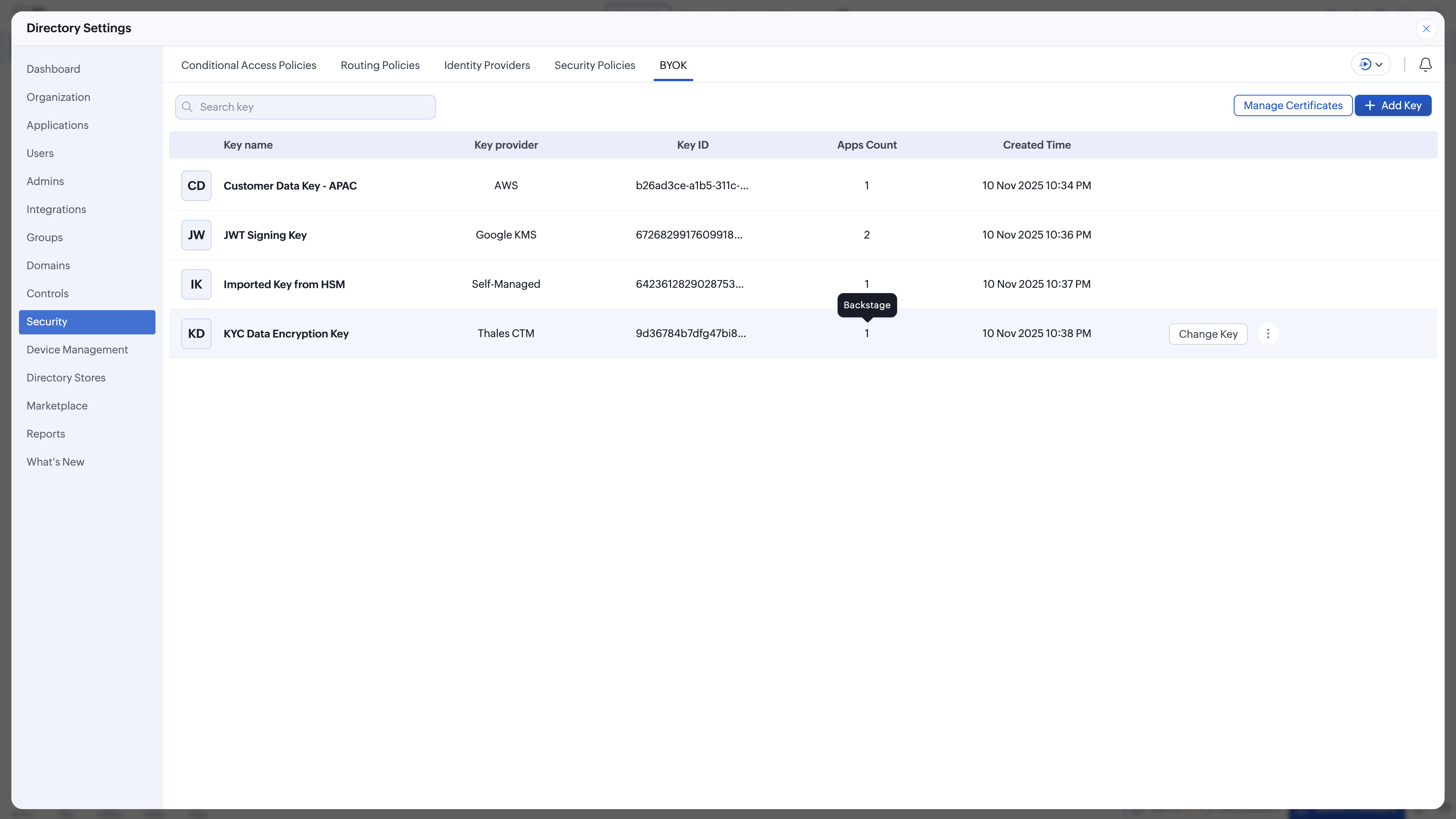 Click BYOK, hover over the key you want to change, and click Change Key.