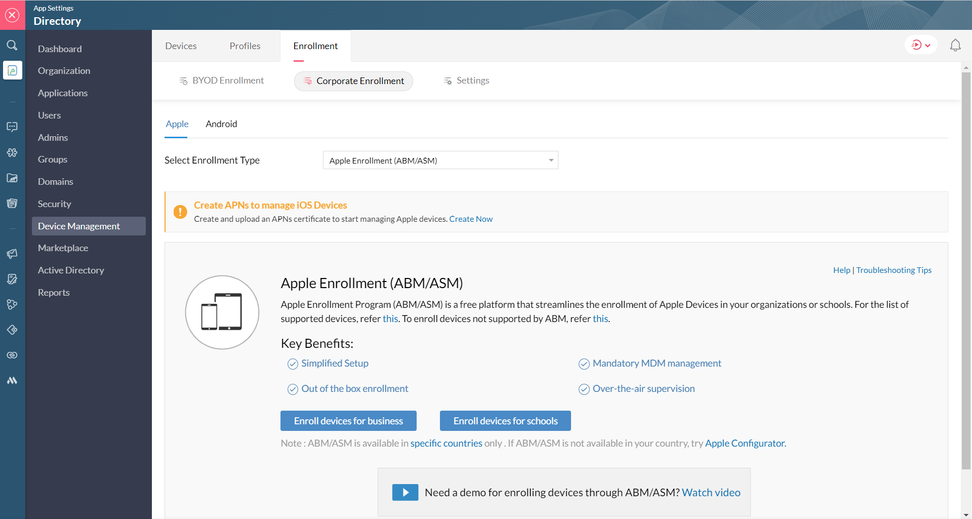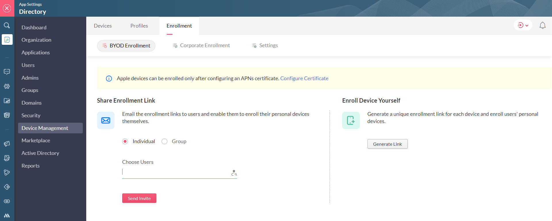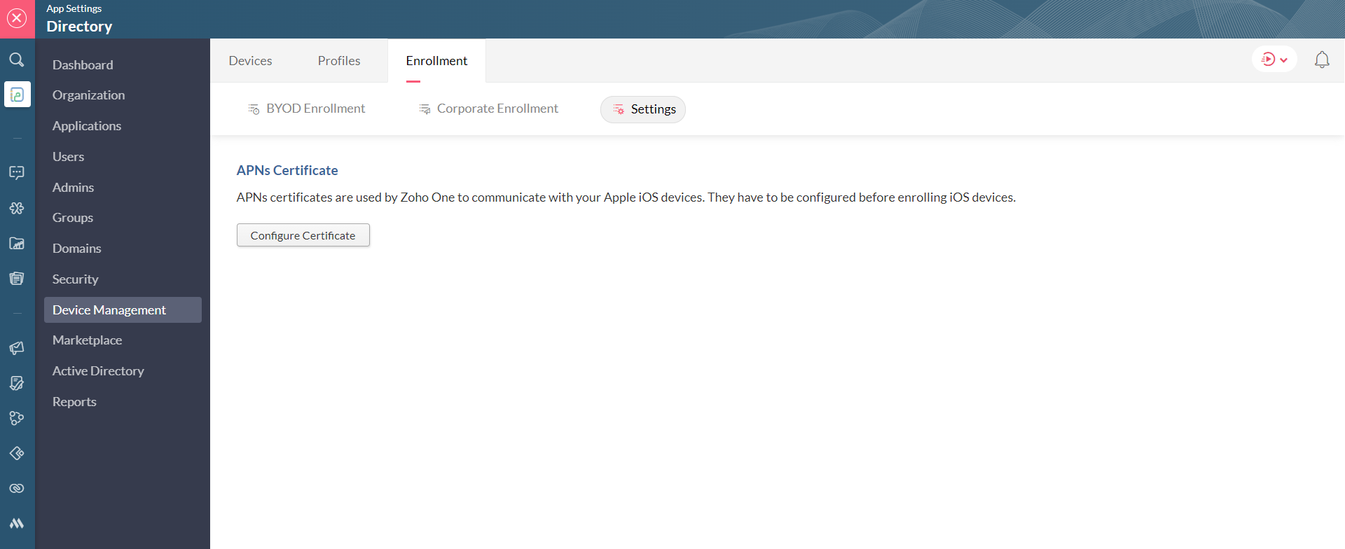 Enrollment allows you to manage your organization's devices through Zoho One. You can assign devices to users in Zoho One after devices have been enrolled. Under the Enrollment tab, you'll be shown three tabs: BYOD Enrollment, Corporate Enrollment, and Settings.