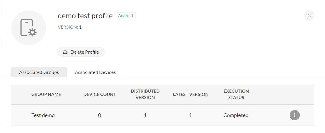 When you click on any profile, the above page will be displayed where two tabs are shown: Associated Groups and Associated Devices. Under the