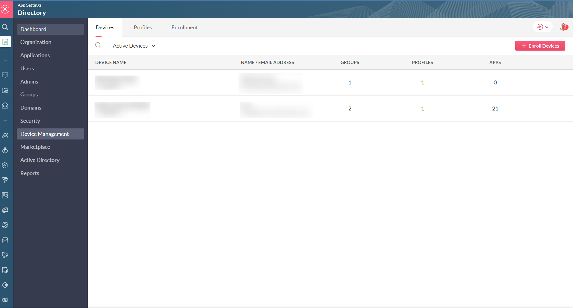 Managing your employees' devices is just as crucial as monitoring their online identities when it comes to making sure they are handling company data responsibly. This is where device management comes in. Zoho One has device management features that can help you make sure that only authorized people and devices are using privileged resources. These features include enrolling both employee personal devices and company-owned devices in your organization, managing what employees can do with their devices by setting up policies and constraints, and ensuring employees get the necessary apps on their devices.