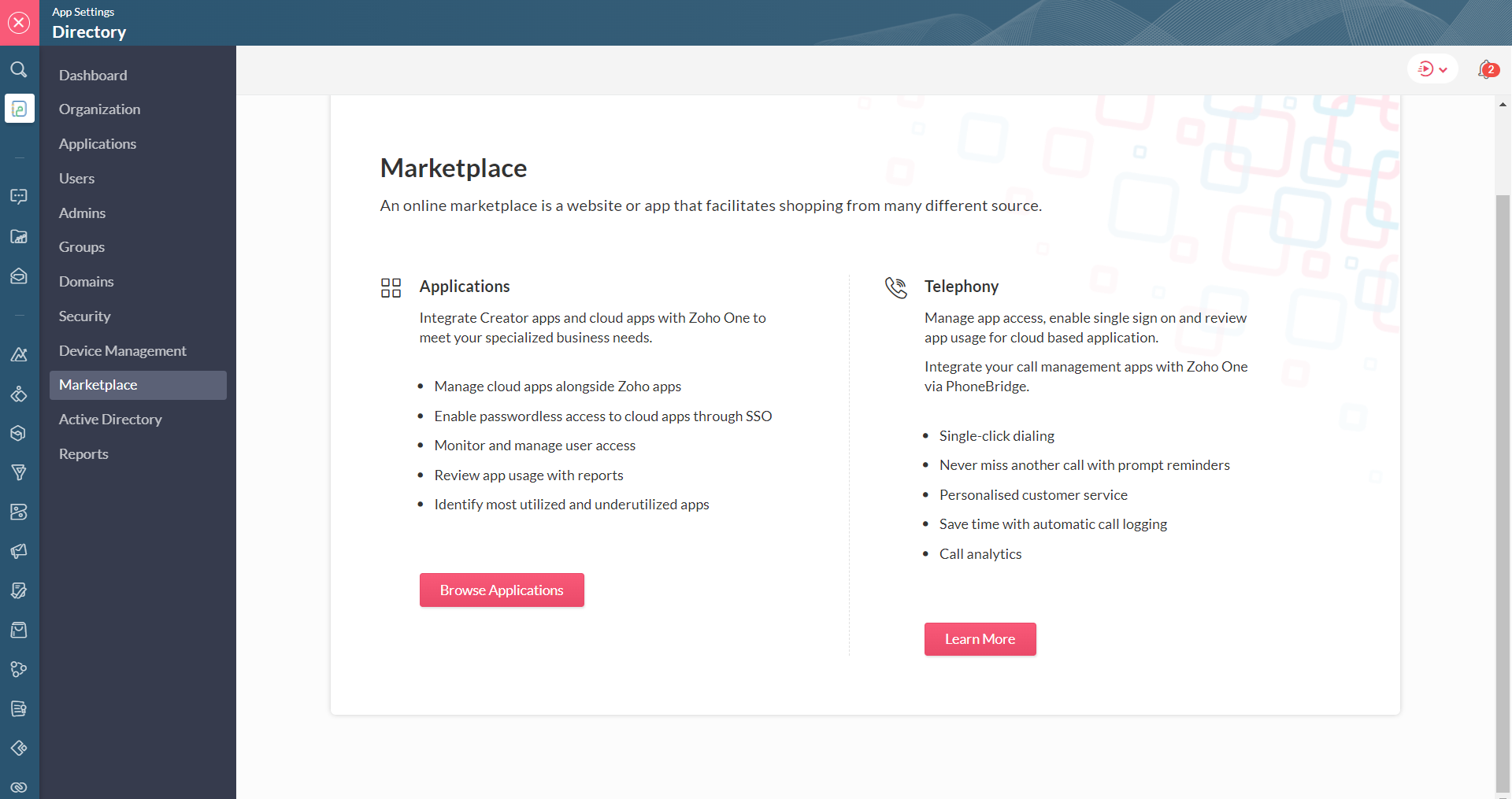Marketplace is an online store where you can browse and install Zoho product extensions, custom applications, and industry solutions. It is also a place where you can set up telephony services for your organization. If you set up your business with Zoho One, but are already using a third-party application for a certain part of your business, you can still set up single sign-on (SSO) for that app with Zoho One as the identity provider (IdP).
