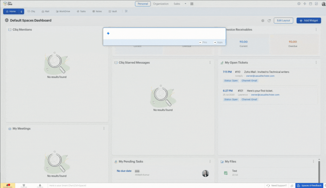 Quick Nav is a navigation assistant that provides centralized search and navigation across 50+ Zoho applications. It provides a unified and consistent interface that helps you quickly switch between apps, explore modules, and find contacts from a single, centralized location.