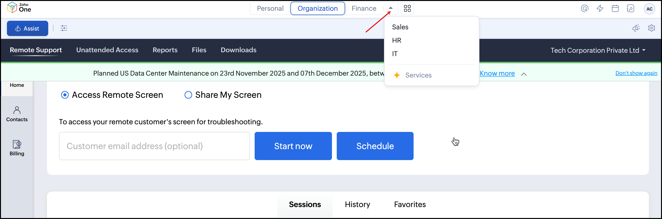 Zylker, a company that runs its business operations on Zoho One, has several employees who use different spaces within the platform. When Emily, one of the employees, signs in to Zoho One, she finds the Spaces menu at the top of the screen, displaying options such as Personal, Organization, Finance, Human Resources, and others.