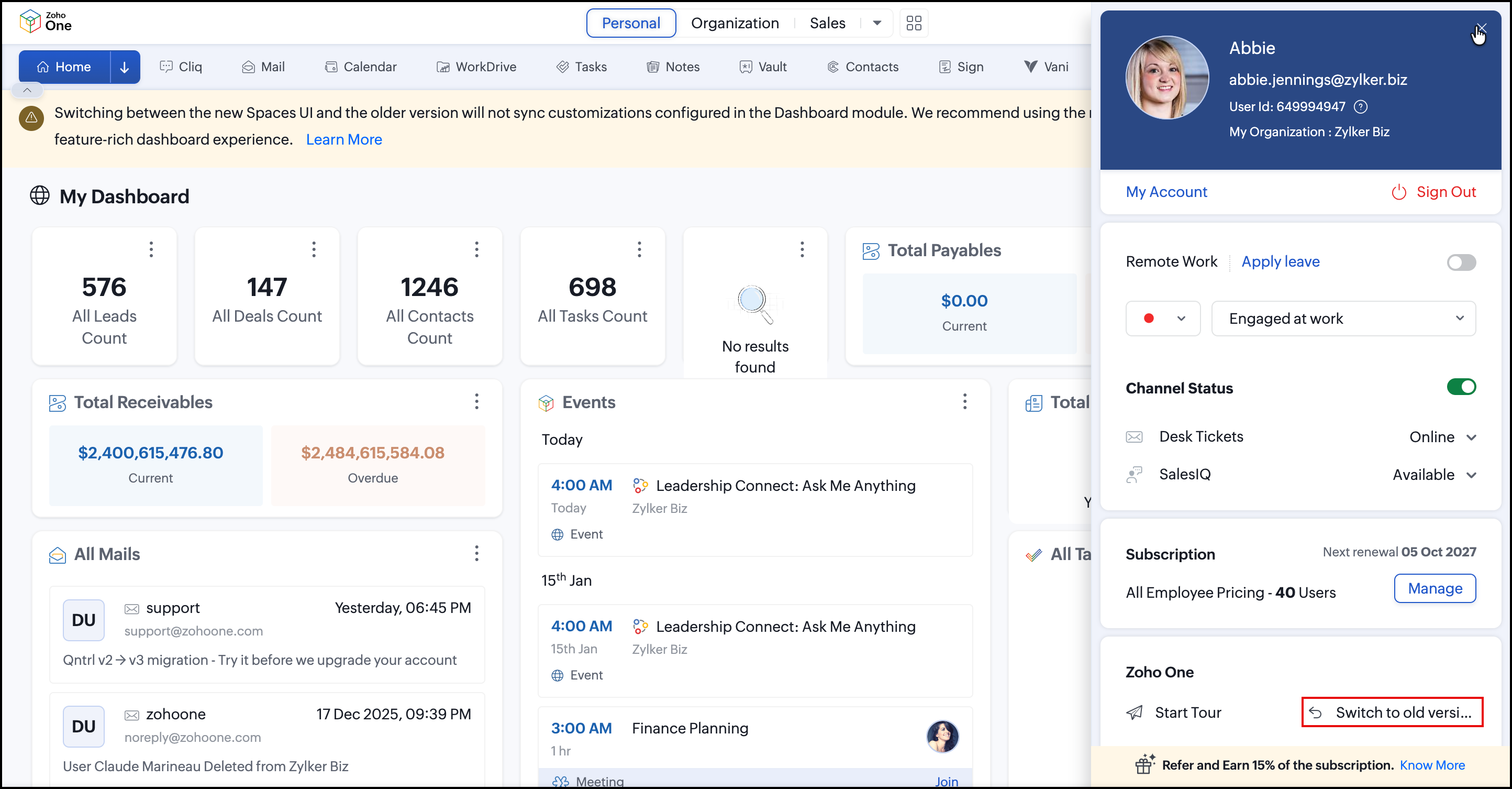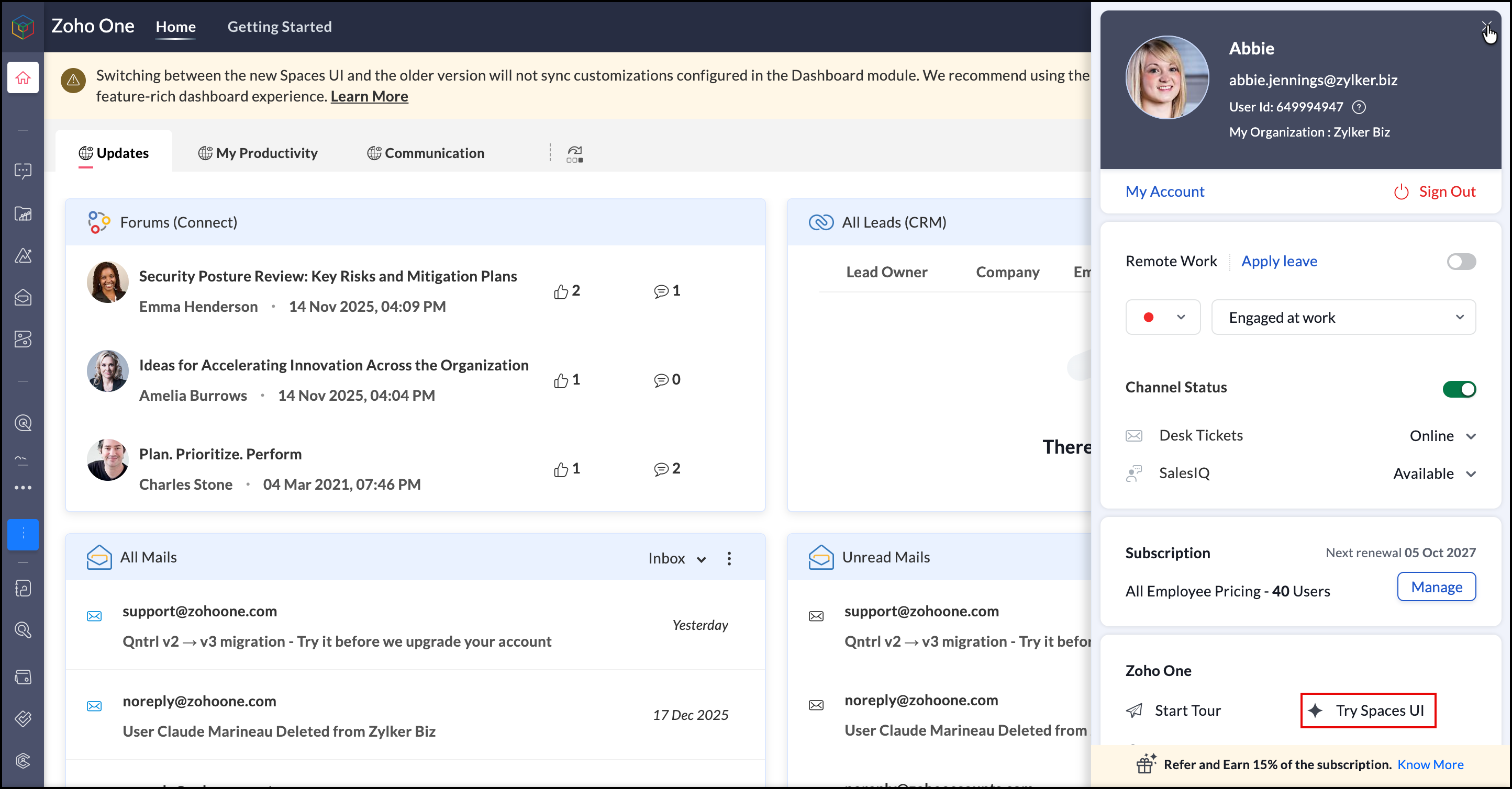 With the ZO25 release, Zoho One sports a new UI that involves Spaces, which increases your efficiency by segregating apps based on their purpose and the business activity involved. However, you can switch back to the older UI and switch back to the Spaces version whenever you want.