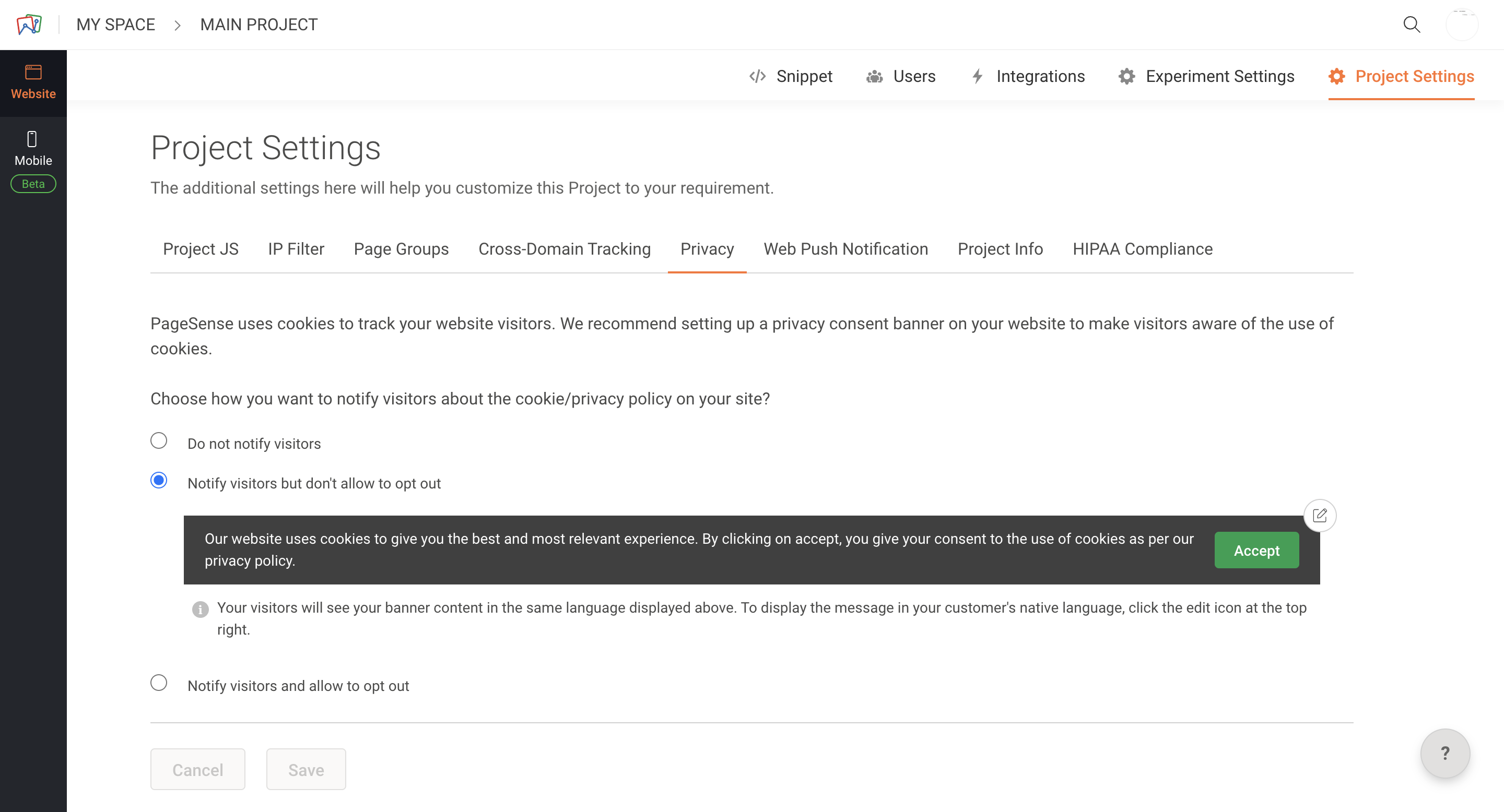 Do not notify: Visitors will not be shown a banner informing them that they are being tracked with cookies.