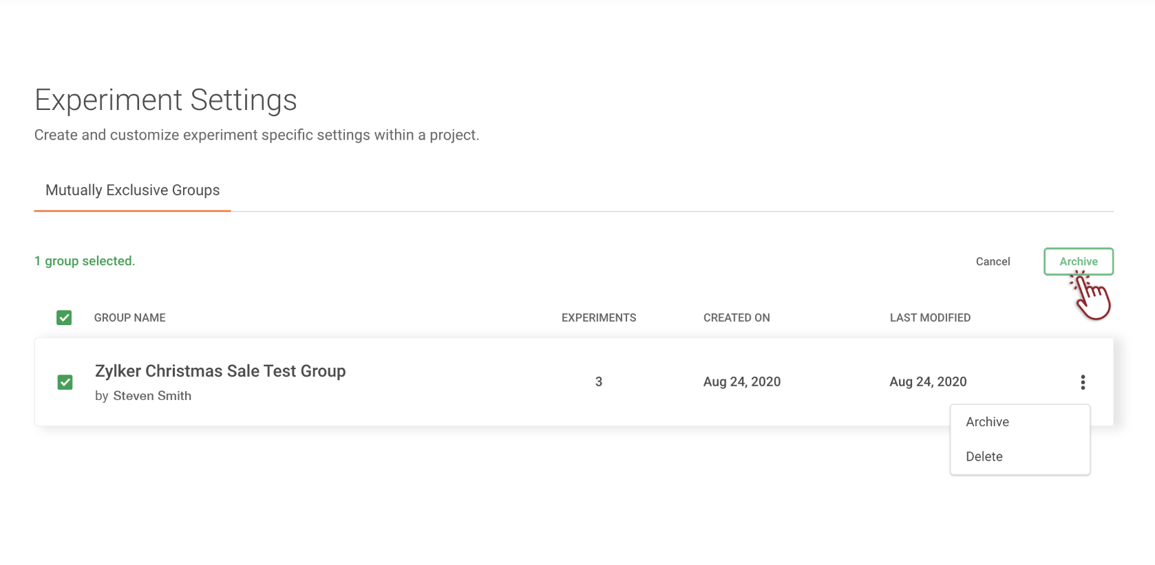 To archive experiments in the exclusive group: