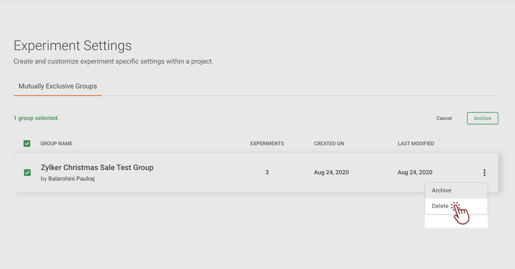 Info: If you delete an experiment from an exclusion group, visitors who were previously included in that experiment will be removed from the exclusion group. This means the visitors won't see any other experiments or campaigns in that exclusion group. However, if you have any experiment or campaign running outside this group, and if the deleted visitor meets the targeting condition, they could see this experiment or campaign.