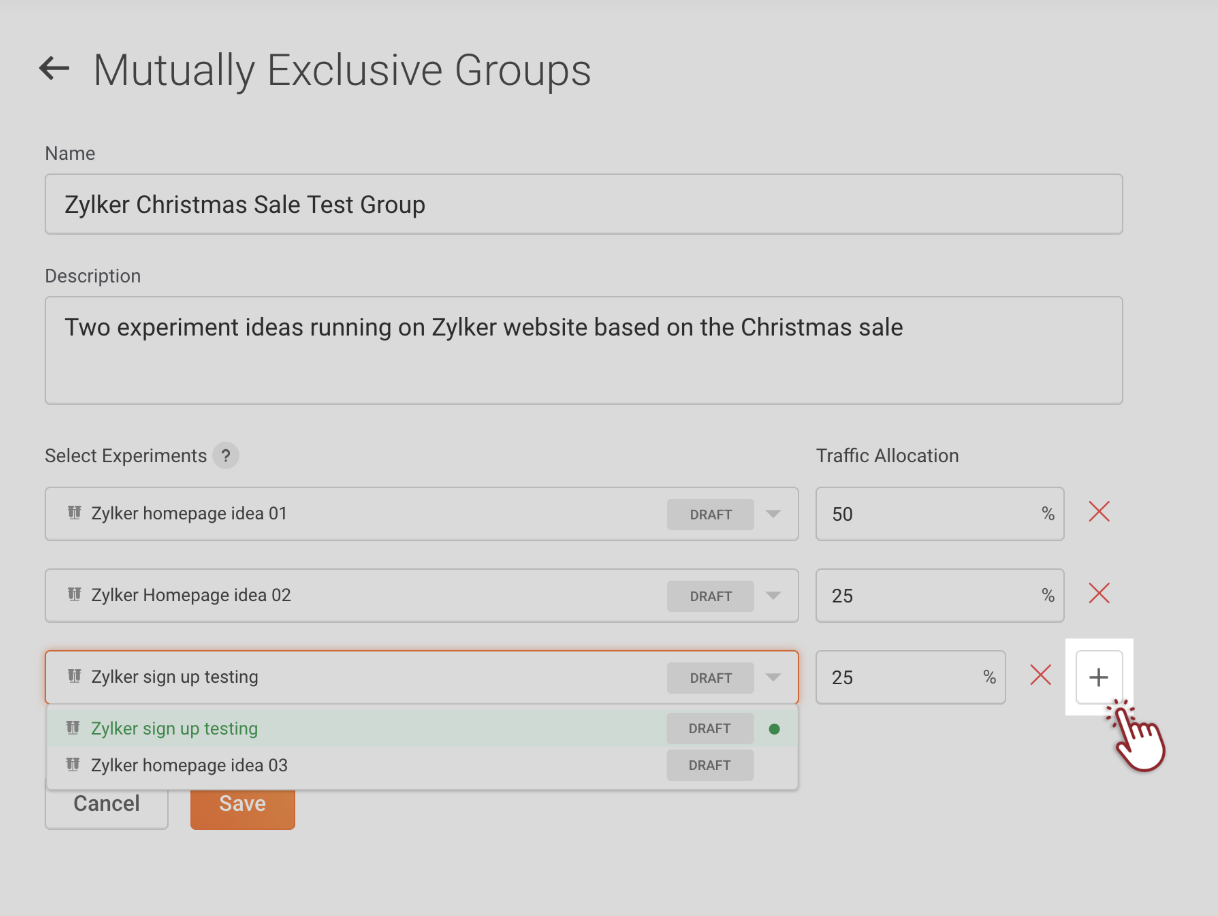 Select the group you want to add the experiment, click the plus icon then from the dropdown choose the new experiment and percentage of visitors to be included.