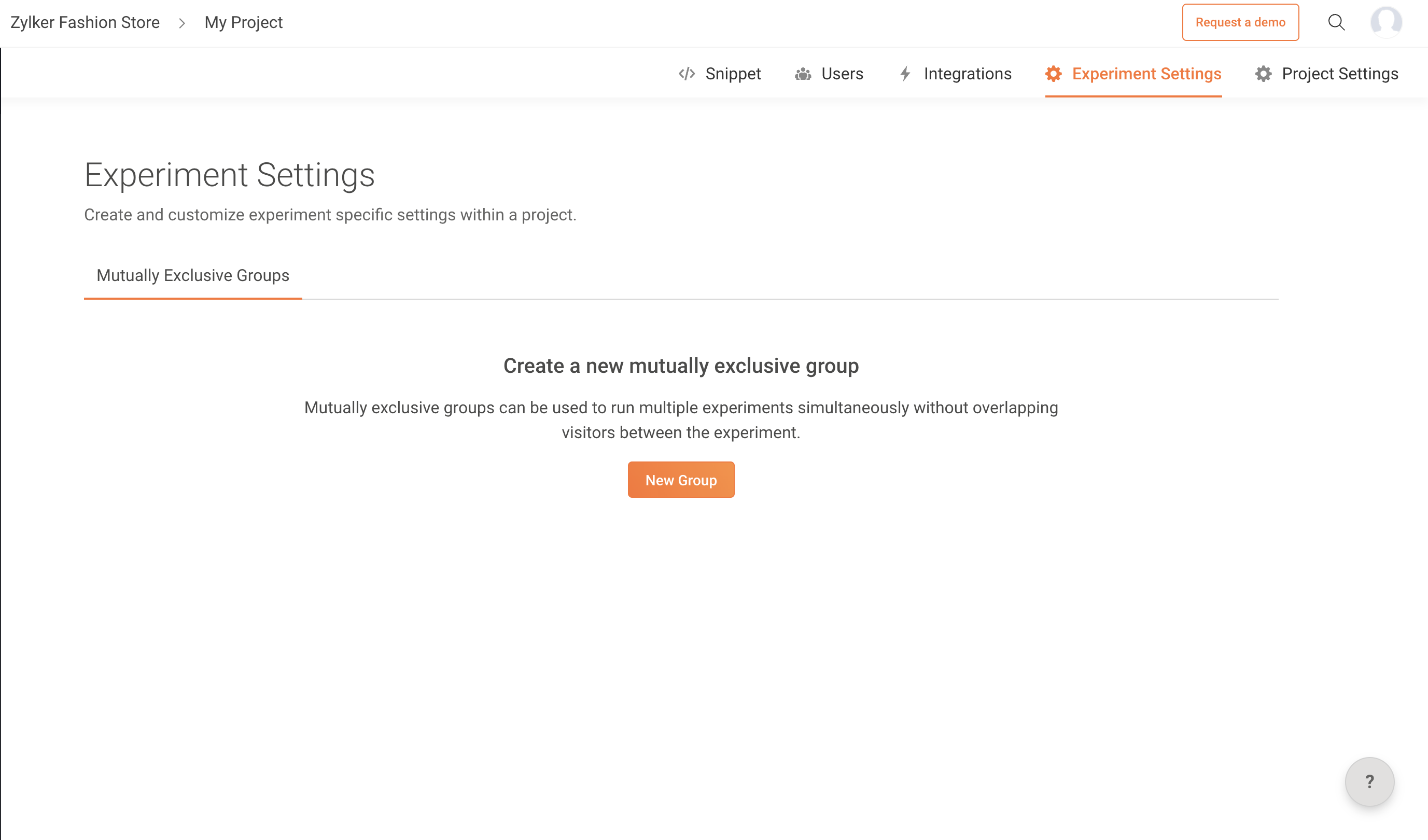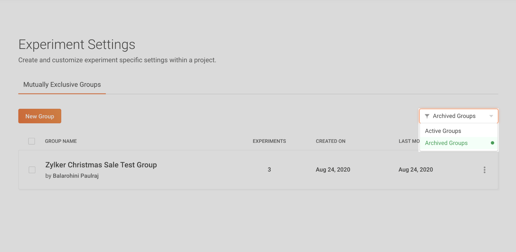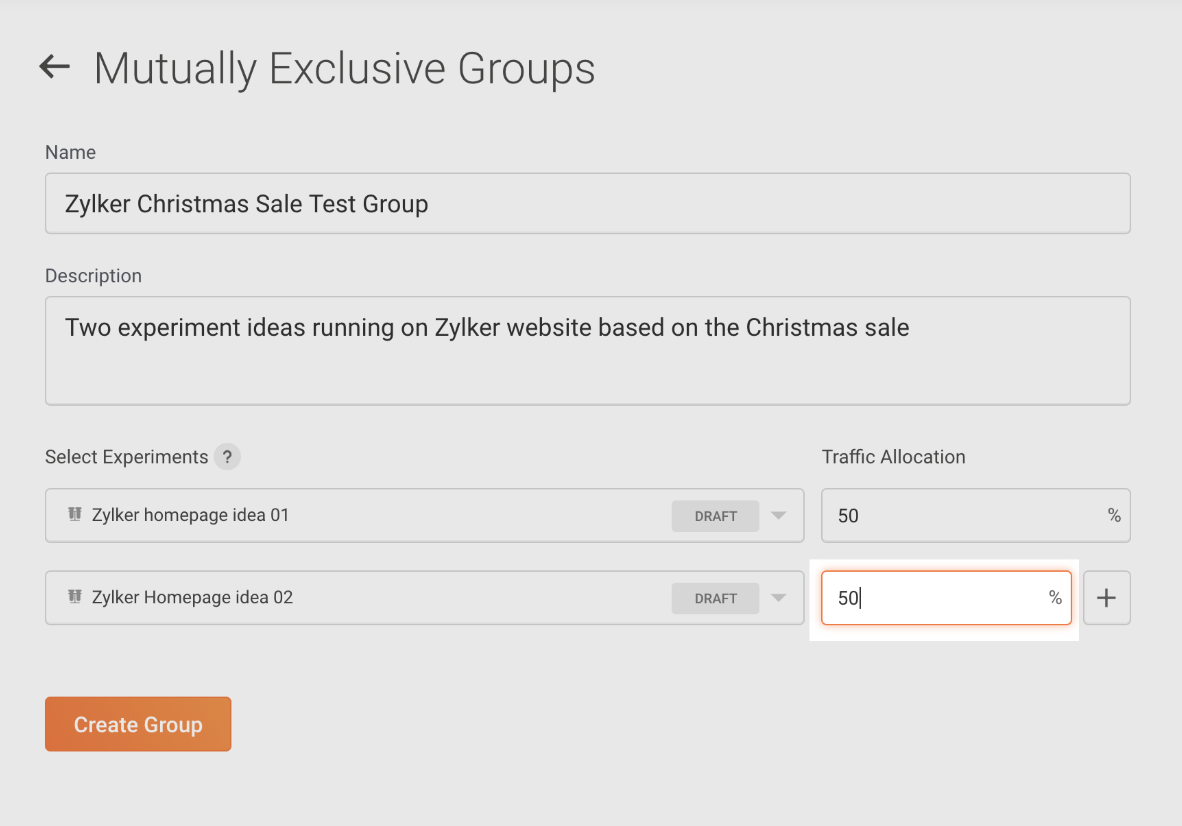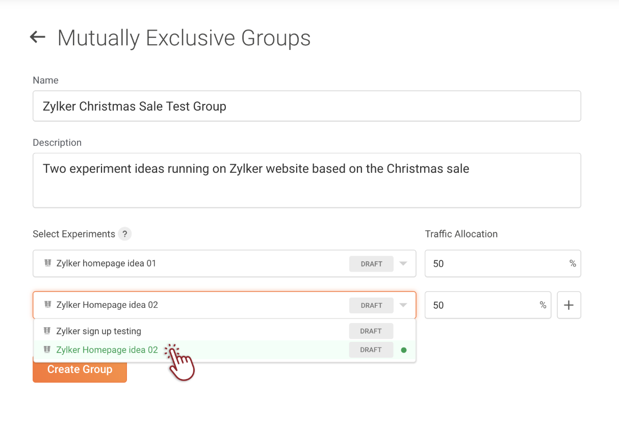 Creating a mutually-exclusive group lets you to split your visitor traffic into the A/B test that you're running, and makes sure that each group of visitors participate in one test only. This way, there’s no possibility that a visitor can pollute the results of one experiment with the variant they. This is because, from a visitors' point of view, there’s only one experiment being runn and shown to them whenever they land on your page.