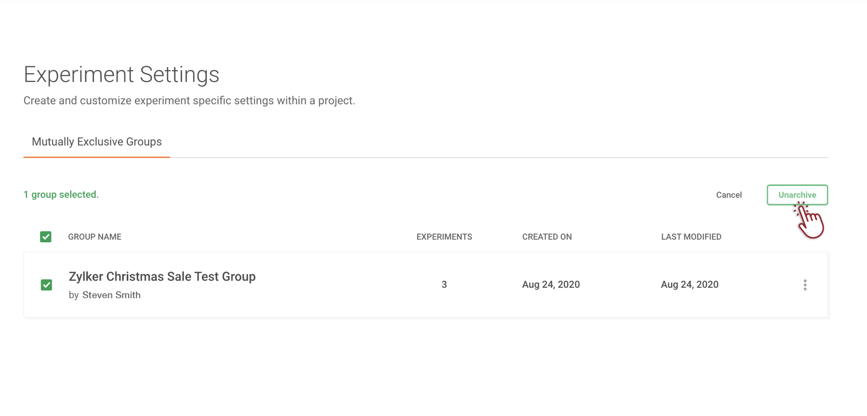 To find and unarchive experiments back to the exclusive group: