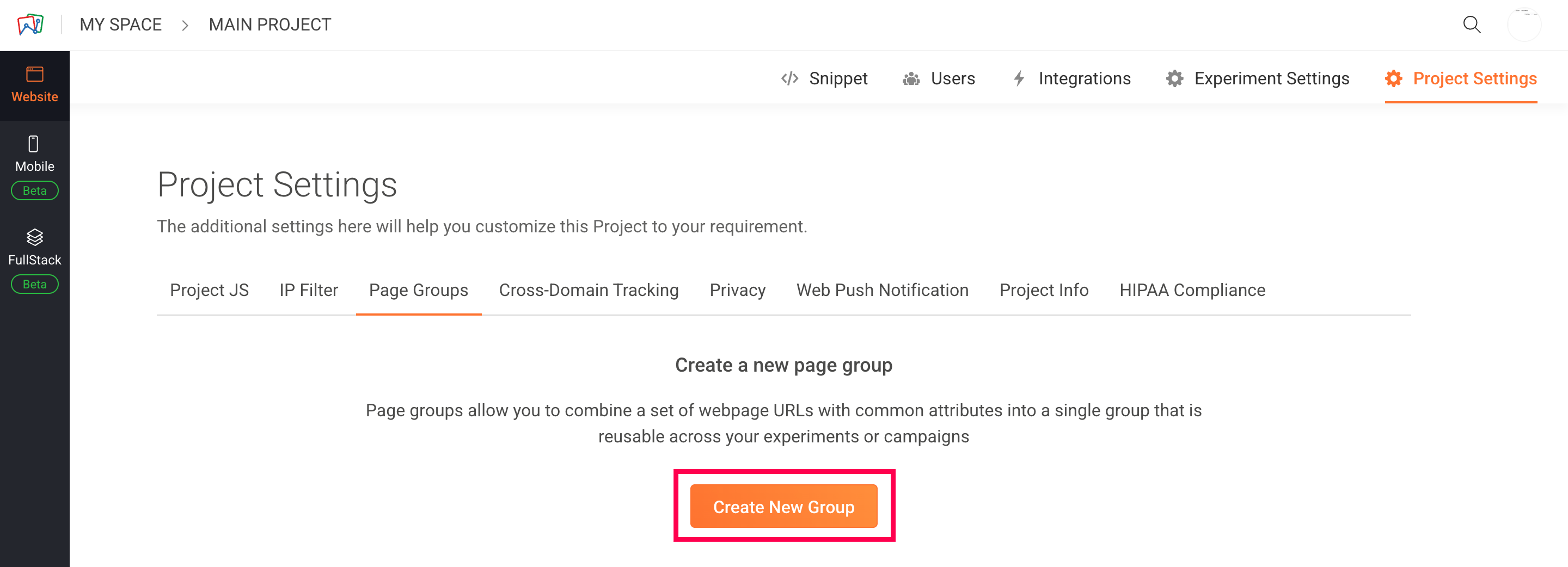 1. Click the Project Settings button in the top bar, then click the Create New Group button under the Page Groups tab.