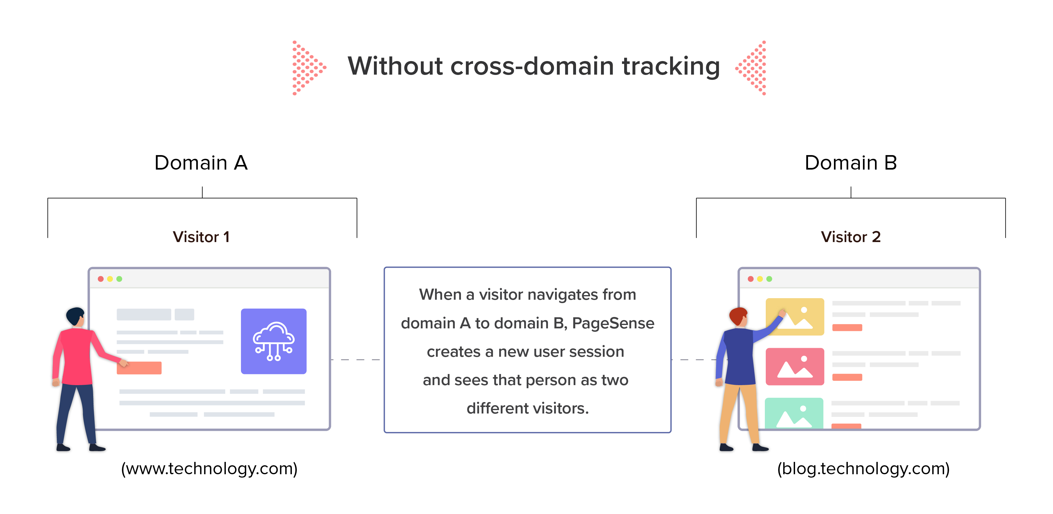 If you don't enable cross-domain tracking, Zoho PageSense will consider a user to be two separate visitors accessing two different web pages. The user session that spans two domains (www.technology.com and blog.technology.com) will also be counted as two different sessions instead of a single session. This leads to incorrect visitor tracking data, which may affect the business decisions you make.