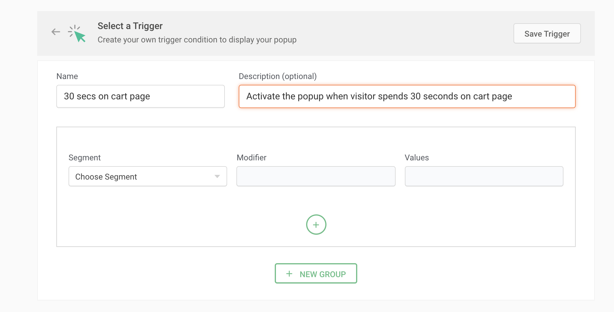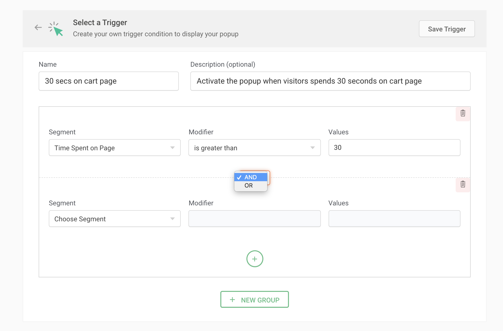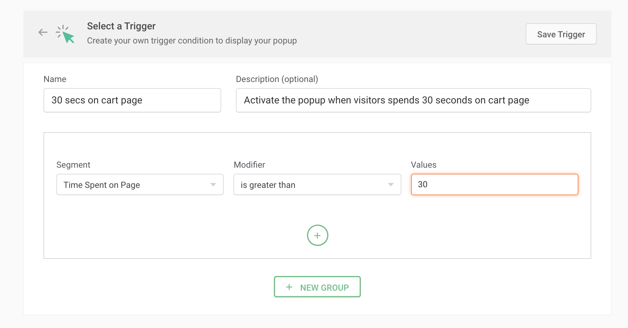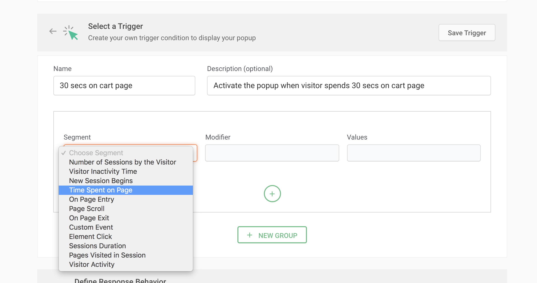 For instance, say you want to subtly show a product updates subscription pop-up to visitors once after they spend a minimum of 30 seconds on your page. For this, choose the Segment as 'Time Spent on Page' and the Modifier as 'is greater than', then enter the value as 30 seconds as shown in the figure below.
