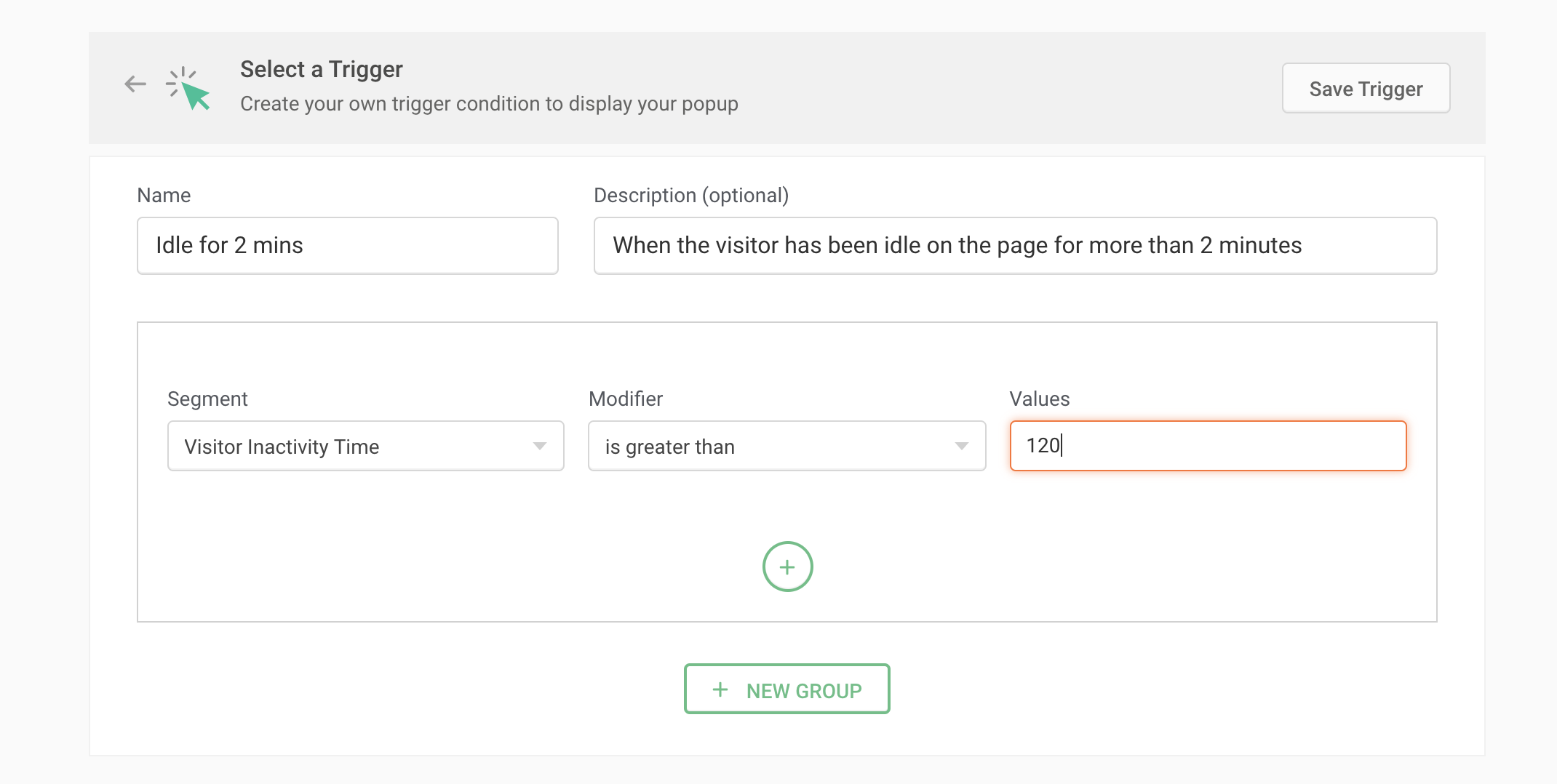 For example, if the visitor is idle on your shopping site's product page for a long enough time, you can show a limited-time offer or last-minute deal pop-up that entices them to continue shopping and complete their order within a few minutes. For this, choose the Segment as 'Visitor Inactivity Time' and the Modifier as 'is greater than', then enter the time (in seconds) after which you want to trigger your pop-up.