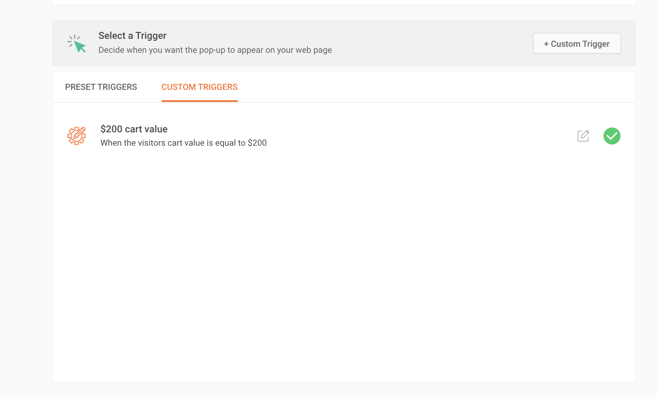 Navigate to the Select a Trigger section under the CONFIGURATION page of your experiment and click the PRESET TRIGGERS tab. From the list, select the preferred trigger option for which you want your experiment to activate. Learn about the different types of preset triggers available in PageSense.