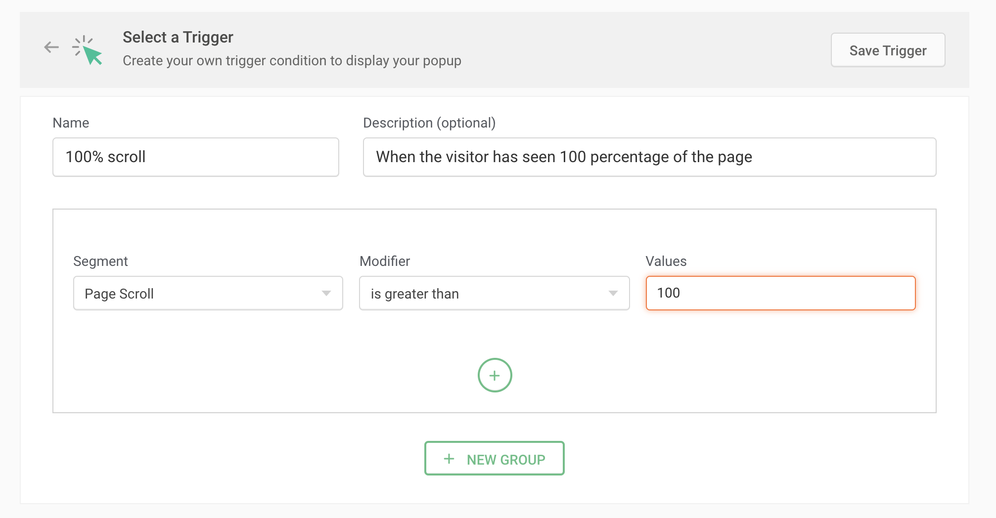 For example, say you own a blogging site and you want to offer a free ebook copy to potential users who have take the time to read and scroll through your content until the bottom of the page. In this case, you can choose the Segment as 'Page Scroll' and the Modifier as 'is greater than', then enter the value as 100% as shown in the figure below.