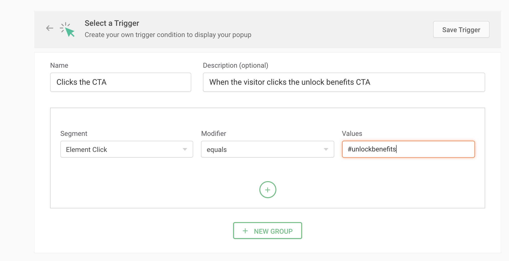 For example, say you're running an elearning platform and you plan to offer an exclusive bonus to learners who click the Unlock Benefits button on your webpage. To do this, choose the Segment as 'Element Click' and the Modifier as 'equals', then manually enter the selector ID, Class, or jQuery of the target element (in this case the Unlock Benefits button) for which you want to trigger your pop-up.