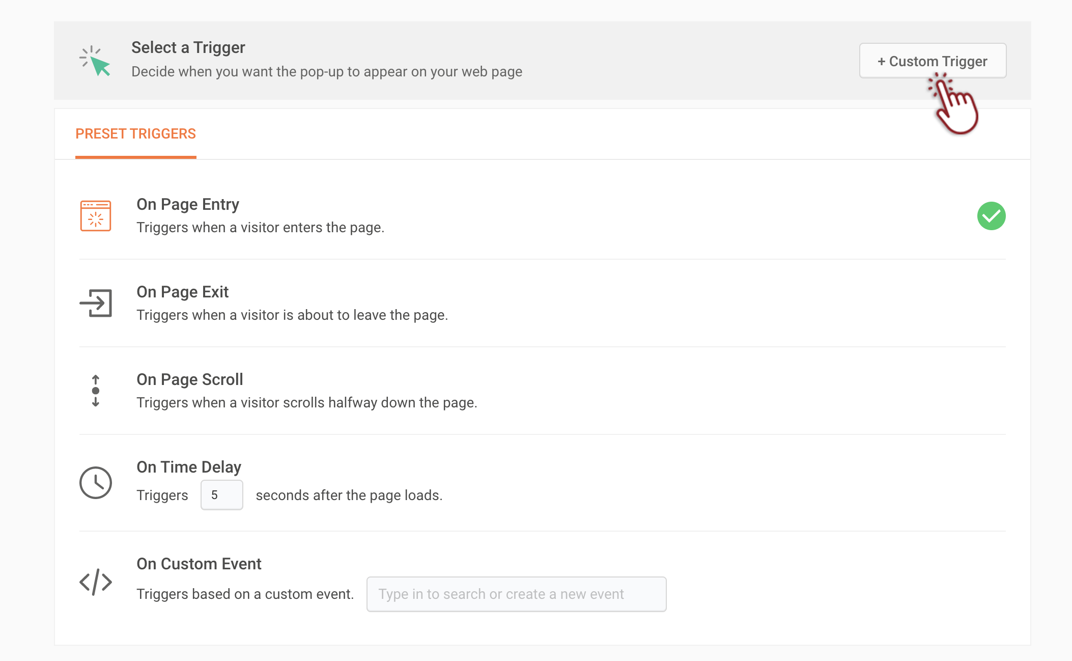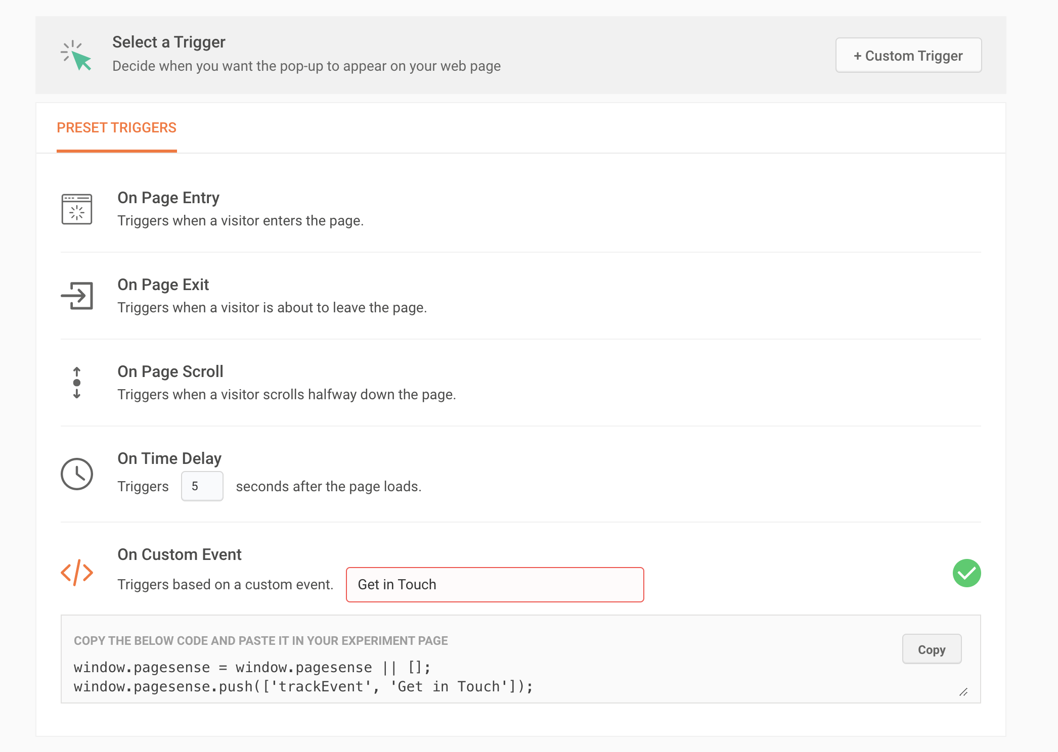 For example, say you've added a 'Get in Touch' CTA button on the pricing page of your website and you want to trigger a contact us form pop-up automatically when the visitor clicks this button. In this case, you can setup a custom event trigger of the 'Get in Touch' CTA on your webpage that opens into your pop-up window.