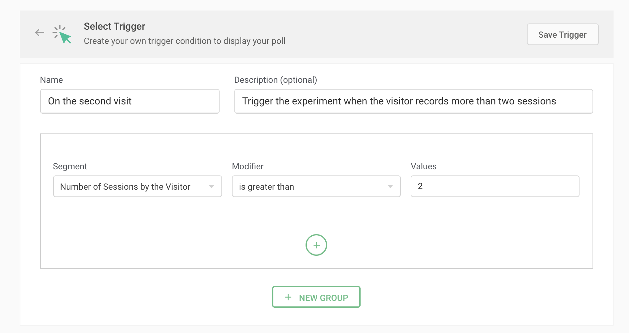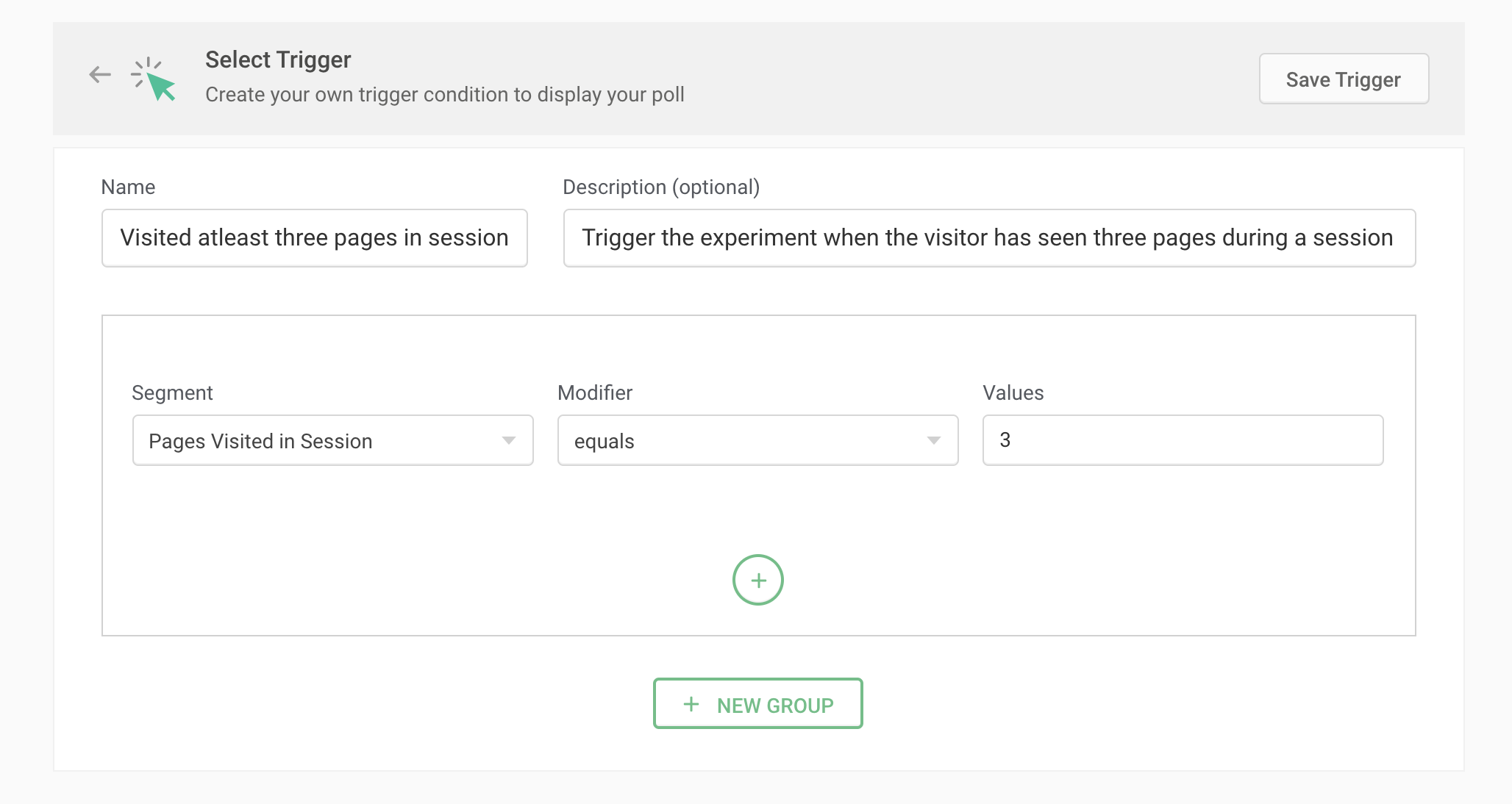 For example, let's say a visitor arrived on your website on Monday and left, but returned on Thursday to read more. That is two sessions; you can choose to trigger a popup or poll to this visitor on their second visit by selecting the right segment value as shown below.