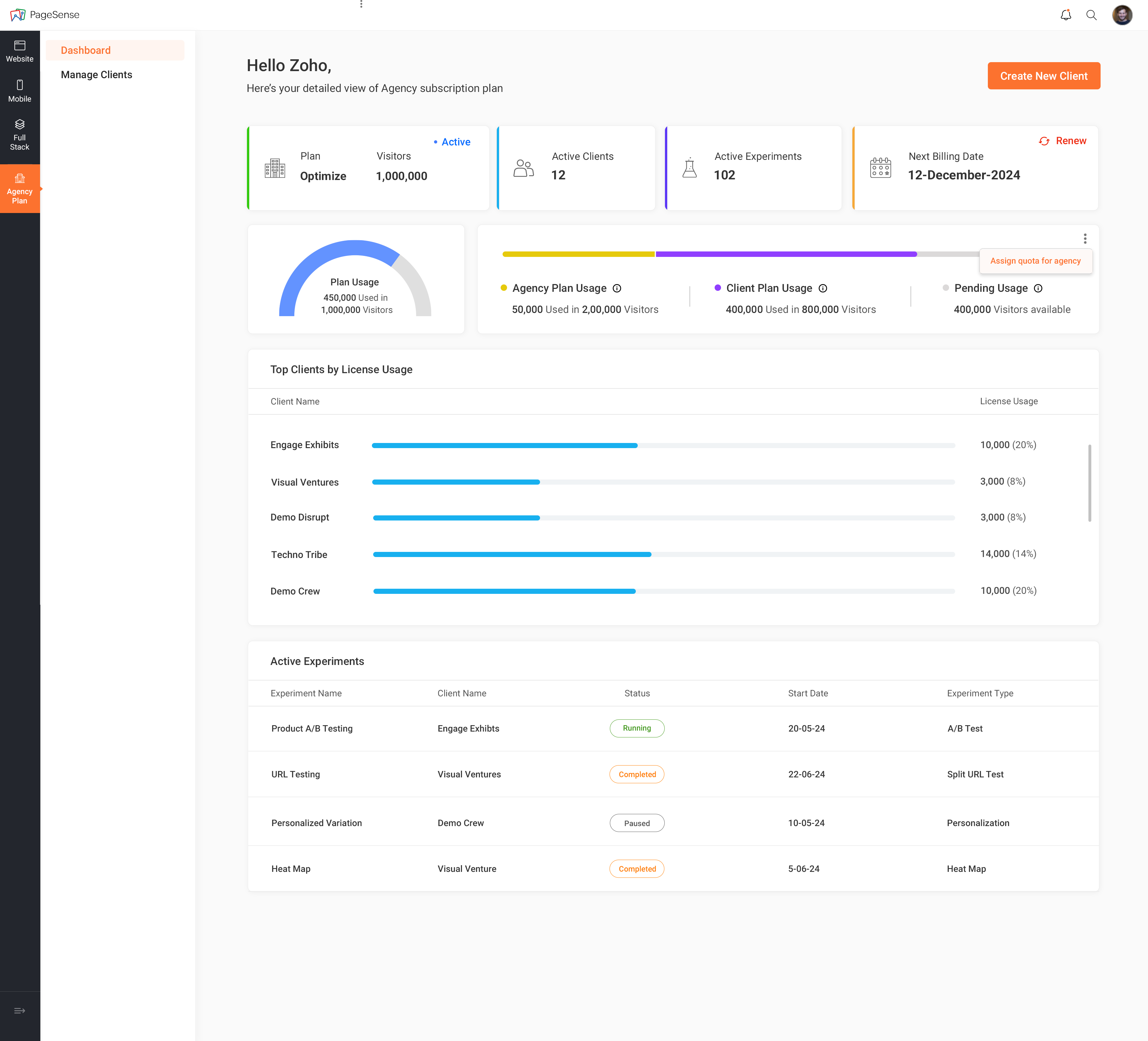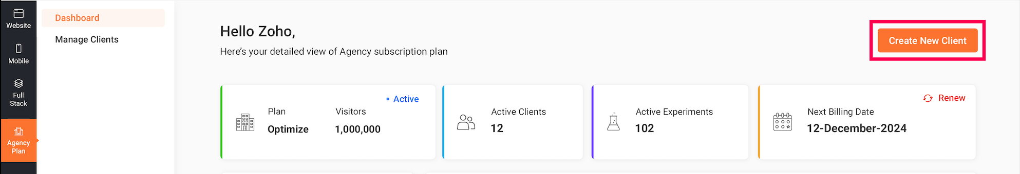 Once you log into Zoho PageSense, you’ll see the Agency module in the left panel.